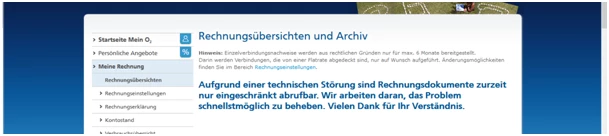 der Rechnungs Download geht seit tagen nicht. ich brauch das Zeug für die Steuer und man kann bei diesem tollen service ja mit niemandne sprechen um das zu klären. Wir lange dauert das noch? übernimmt O2 dann den schaden wenn ich nichts beim Finanzamt vorlegen kann?