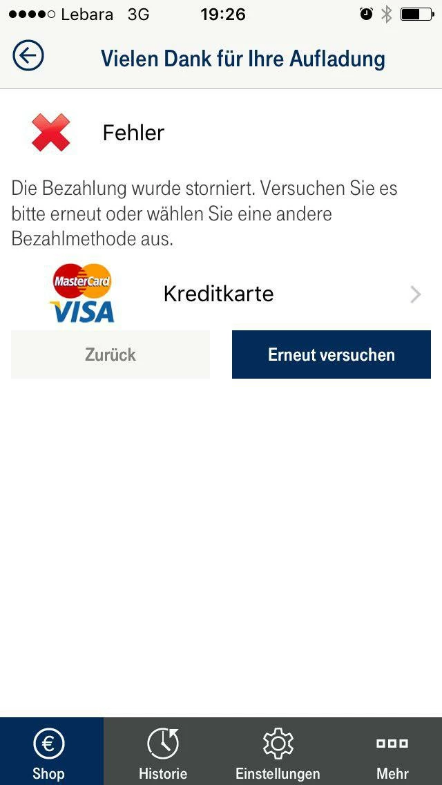 On Sunday (19.11.2017) I've tried to top up my prepaid card using O2 Prepaid app. I tried to pay with PayPal, who refused to proceed with payment. Then I decided to pay with credit card, I've entered all details, 15 EUR payment was charged from my card, but later app said, that my payment was rejected (see screenshot in attachment).
