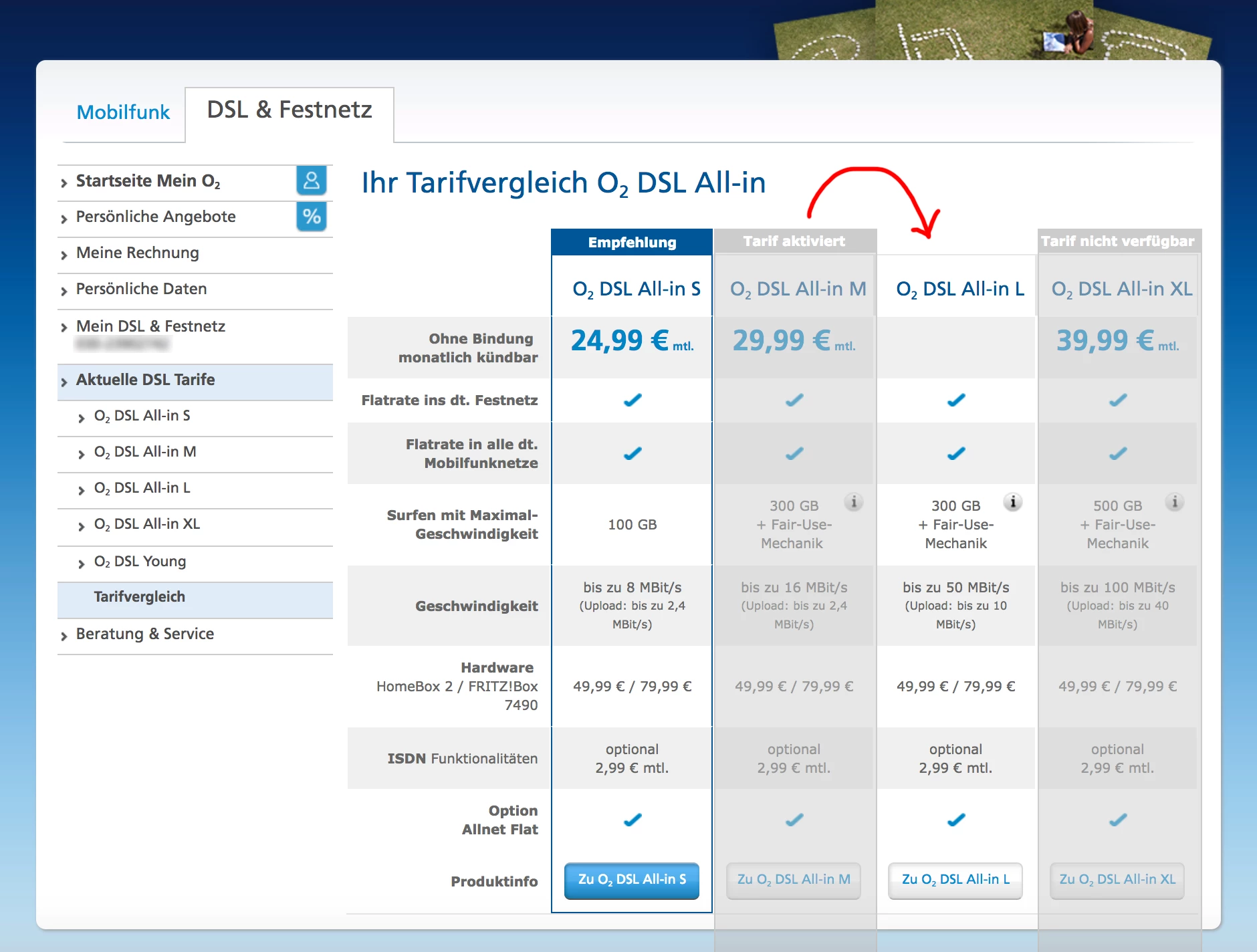 If possible, I would really appreciate getting some help in English. Basically, I would like to upgrade my current o2 DSL All-in M subscription to the o2 DSL All-in L offer. I assumed I could do it online by myself from my account but this is apparently not possible; the offer is displayed but there is no way to select it (see screen-capture enclosed below). I have of course checked and this offer is available in my street. Who should I contact? Both chat and hotline do not want to speak in English; and my poor level in German does not allow me to ask the questions I want. My contract ends in December 2017 but there is no reason that o2 would prevent me to switch to a higher offer. Thanks.