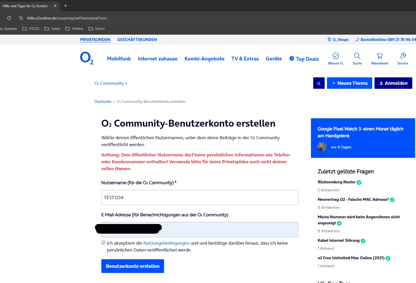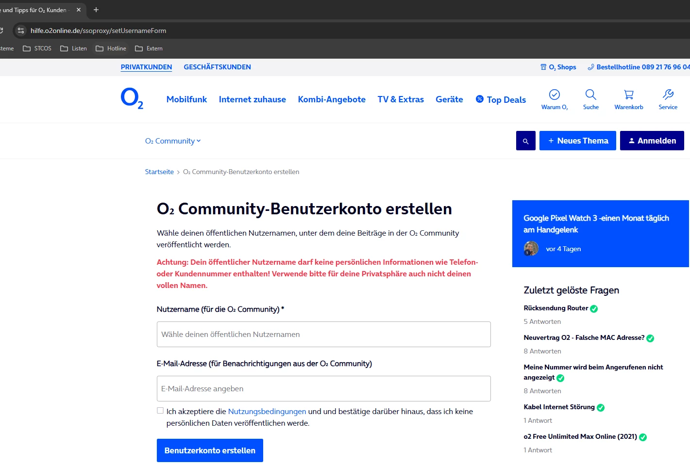 Habe das selbe Problem. Login auf meinO2 erfolgt, aber wenn man hier Antworten will bzw. einen neuen Thread erstellen, kommt man auf die Seite, um einen neuen Account anzulegen bzw. einen Usernamen und eine Email Adresse zu setzen. Wenn man dann seinen alten Username und die Mailadresse wählt, kommt keine Fehlermeldung aber man landet dann wieder am Anfang. Erst, wenn man einen anderen Usernamen wählt, kommt man weiter.  Aber man hat halt nen neuen Account, der vermutlich nicht mit dem Vertrag verknüpft ist.