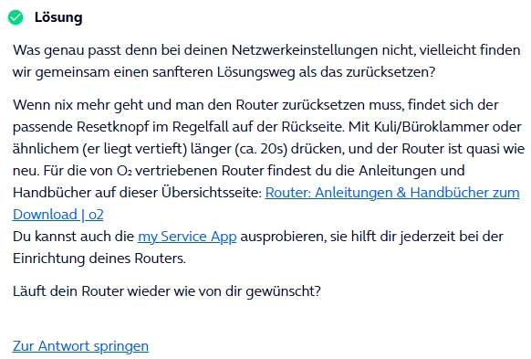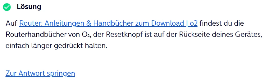 Eine Lösung ist die Antwort auf eine Frage, welche als “Beste Antwort” markiert wurde. Diese Entscheidung trifft der Mensch welcher die Frage gestellt hat oder alternativ das O₂ Community Moderationsteam und unsere O₂ Community Expertinnen und Experten. So sieht eine Lösung in der Community aus:
