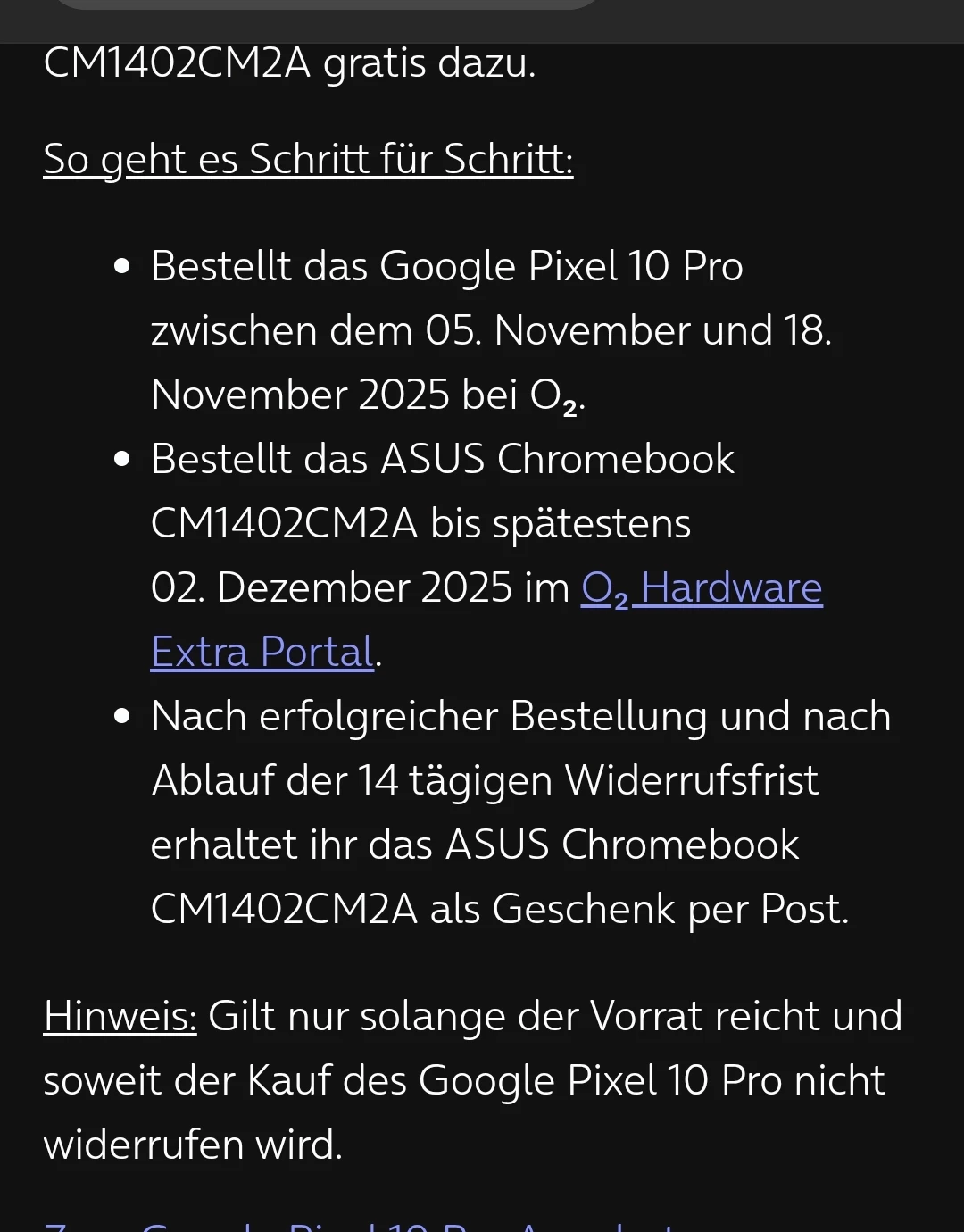 Ich habe auch den Google Pixel 10pro mit Chromebook in einer Aktion gekauft. Bis jetzt kein Chromebook ist angekommen. Der Verkäufer meinte, es wird nach der Wiederrufsfrist kommen, die ist aber schon ein paar Tage hier. Hab den Kauf am 17.11.2025 gemacht. Auch der Kundenservice kann nicht helfen. Sie haben es gar nicht im System. Auf meinem Kaufvertrag ist es aber sichtbar. Ich komme mir total blöd vor.