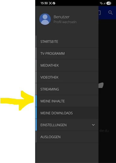 Ebenfalls unter ‘Meine Inhalte’, findest du die Rubriken: ‘Verfügbare Aufnahmen’, ‘Geplante Aufnahmen’ und wenn du schon etwas angefangen hast zu gucken ‘Weiterschauen’.