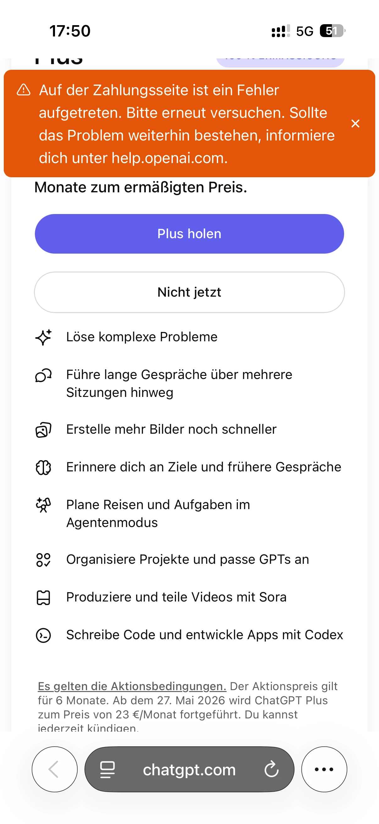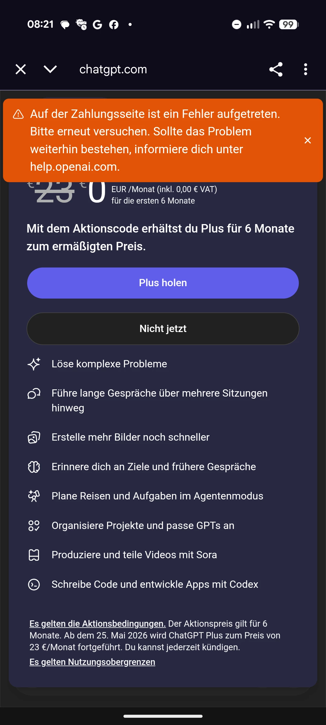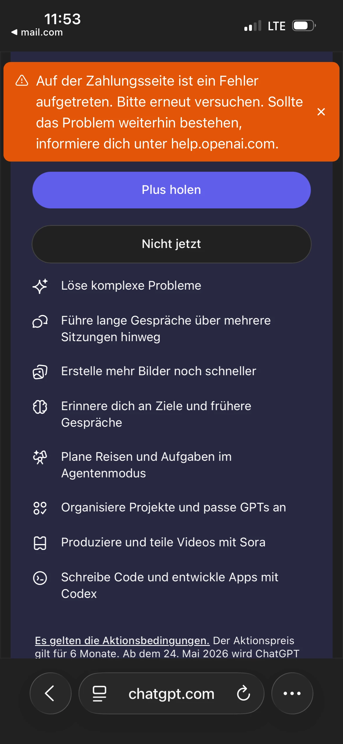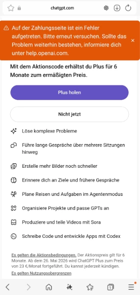 @NB_15 , was mir gerade noch zu deiner Fehlermeldung eingefallen ist: probiere bitte mal dich mit einer neuen Mailadresse für ChatGPT zu registrieren und dort dann den Code einzulösen. Das hat in einigen Fällen bei deiner Fehlermeldung geholfen 🙂