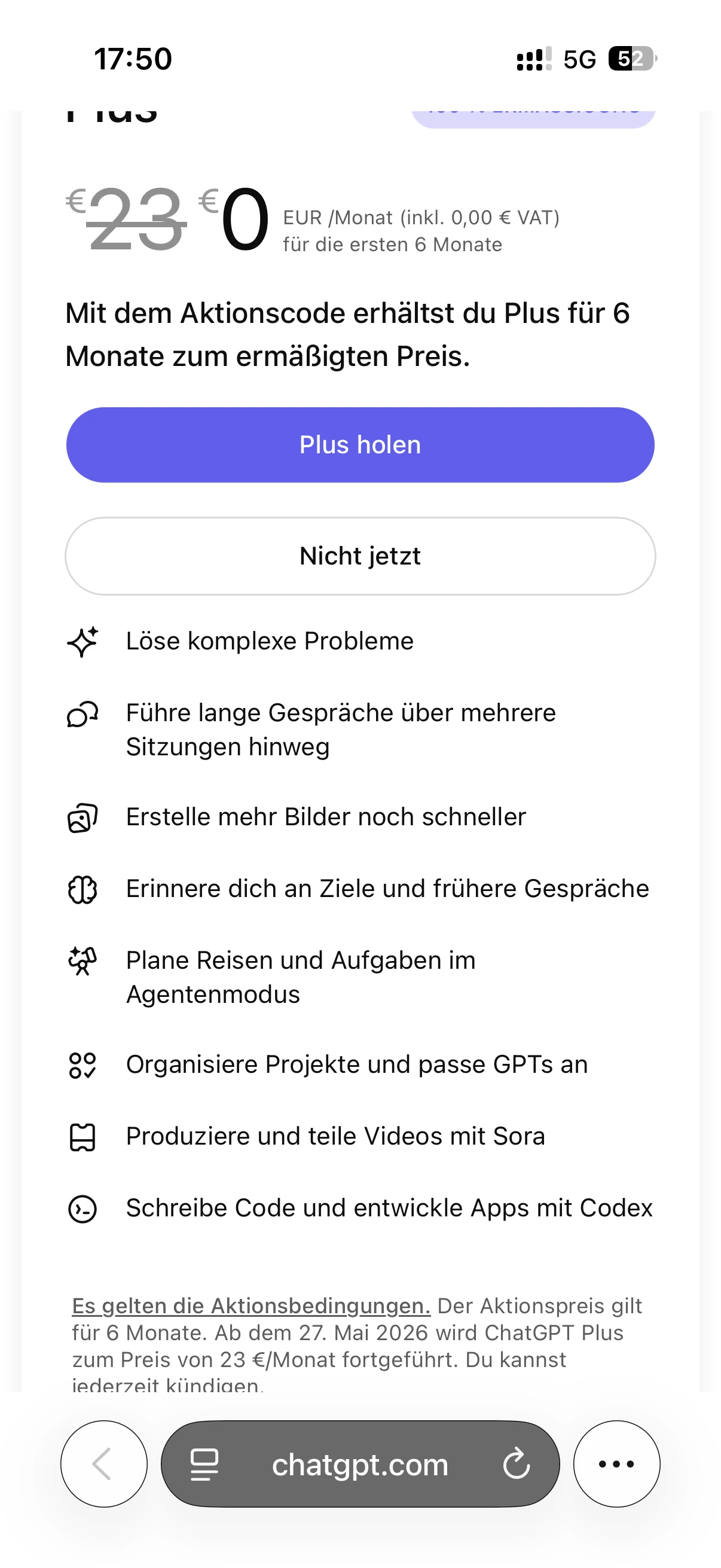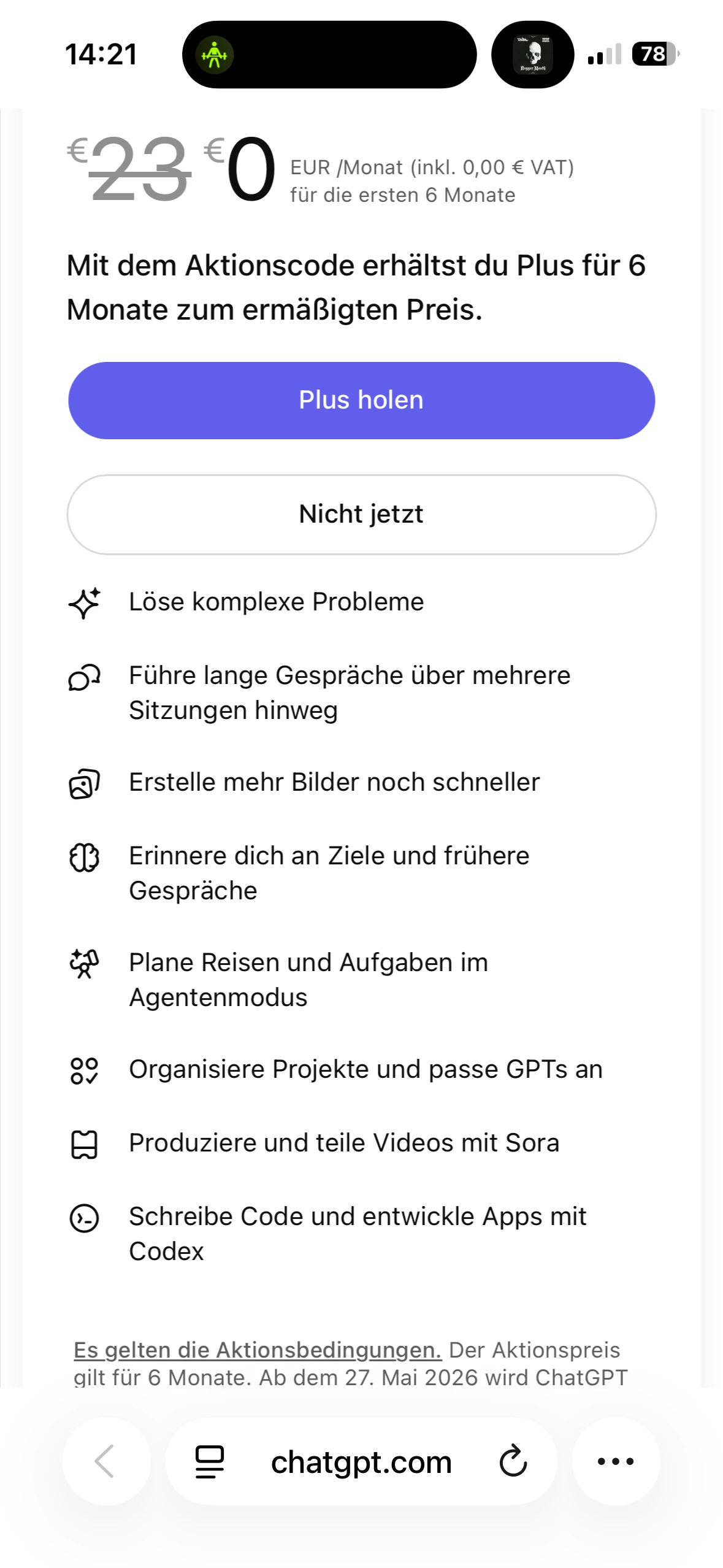 Da es sich um das aktuelle O₂-Angebot handelt, bei dem man ChatGPT Plus für 6 Monate kostenfrei erhält, bitte ich Sie freundlich, mir auch für die zweite Vertragsverlängerung den entsprechenden Link bzw. Code zukommen zu lassen.