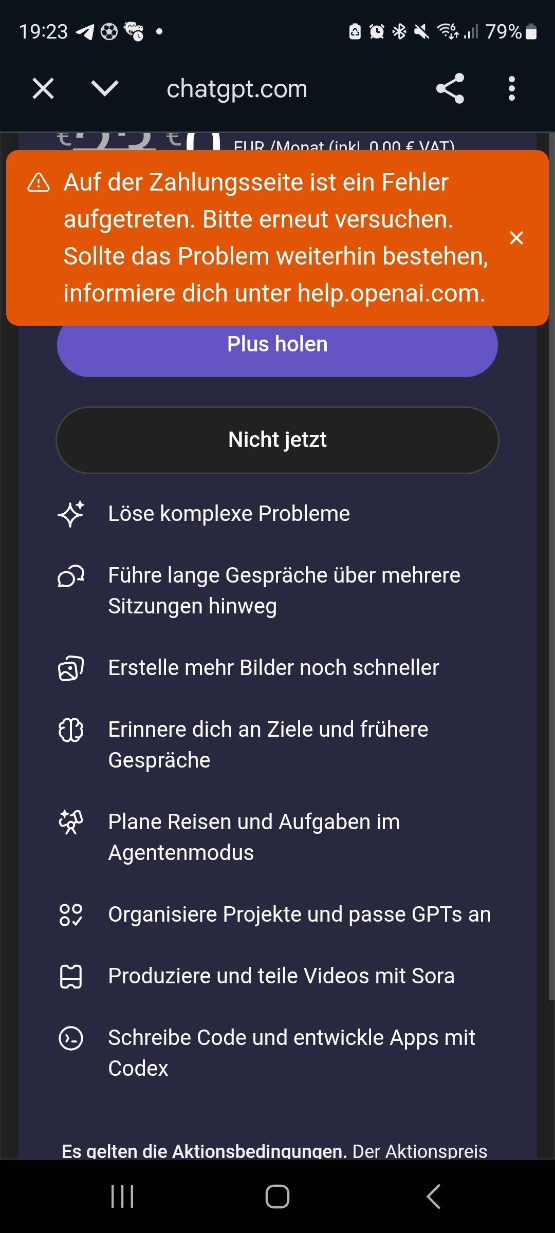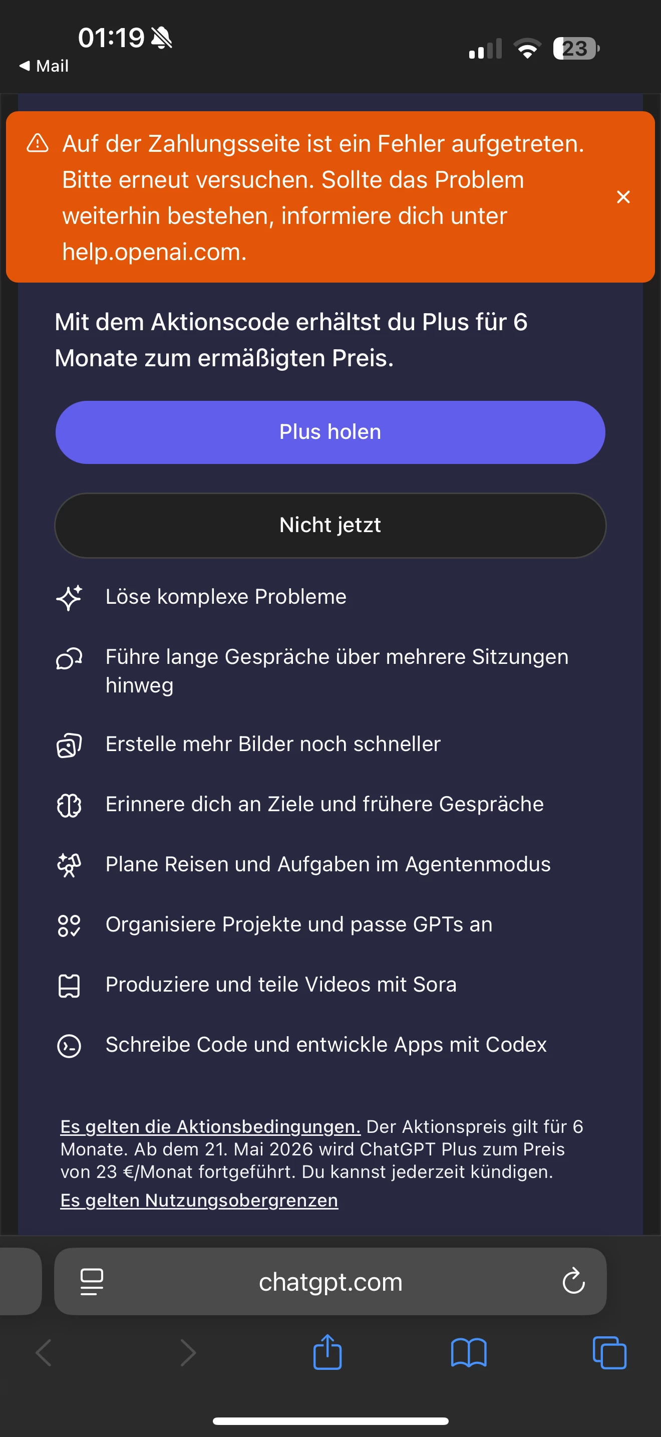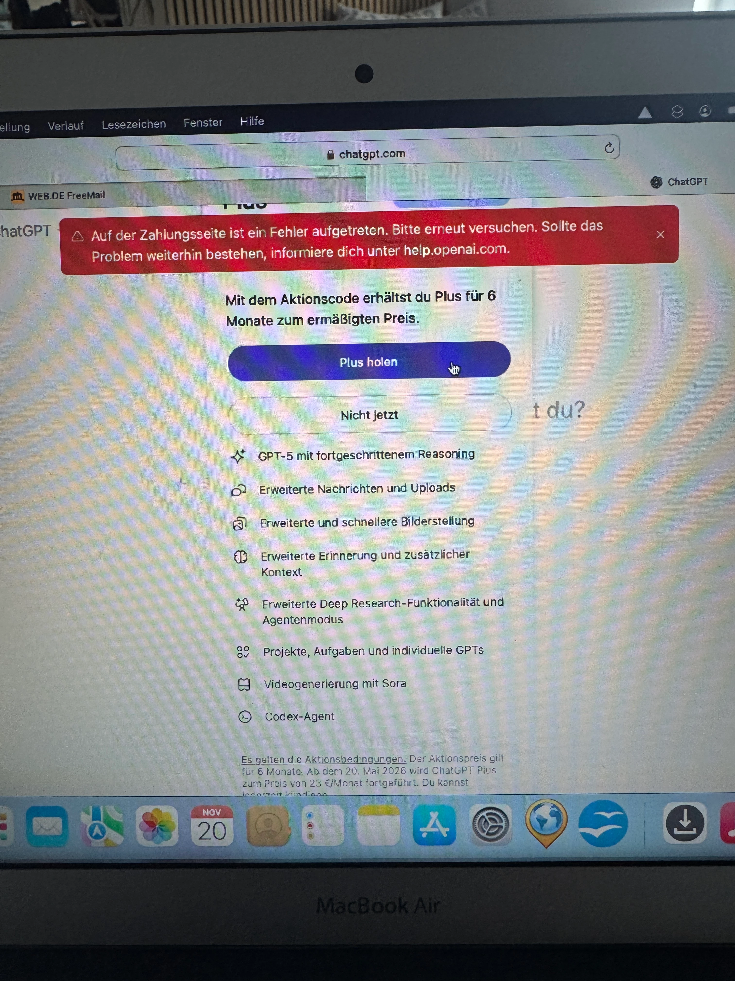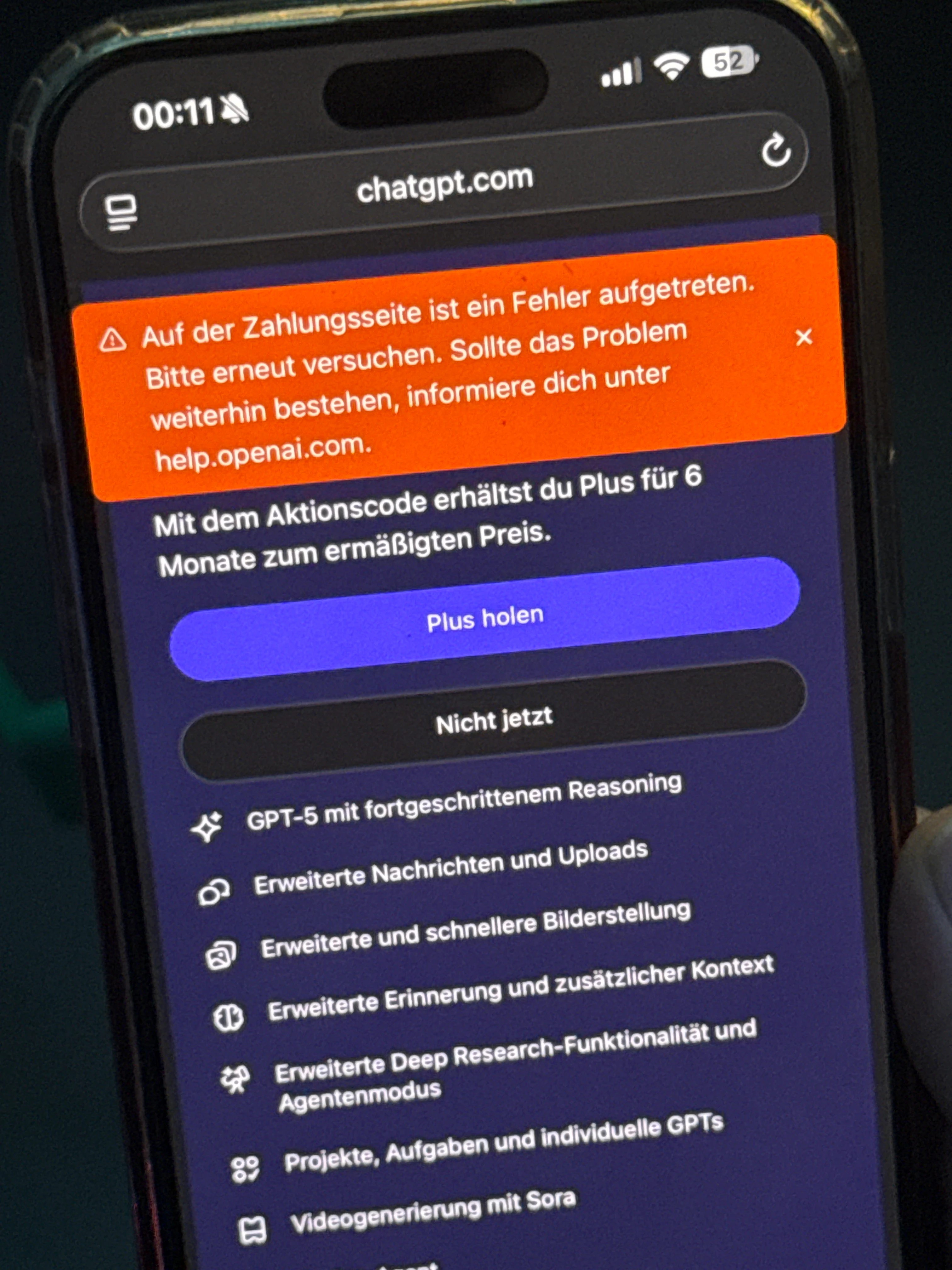 Gar nicht schön, dass es so beharrlich Fehlermeldungen bei euch hagelt, wenn ihr das 6 Monate Chat GPT Angebot über den Promocode aktivieren wollt.
