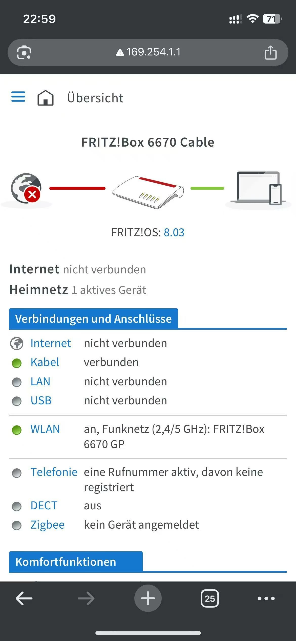 Ich nutze den Router erst seit zwei Wochen, seit der Aktivierung. Da niemand den Router berührt hat, kam ich nach Hause und die Info-LED leuchtete, aber ich hatte keinen Internetzugang. Ich bin nun seit einer Woche ohne Internet. In dieser Zeit habe ich versucht, das Problem selbst zu lösen. Letzten Freitag rief ich den Kundendienst an, und mir wurde gesagt, ein Techniker würde sich bei mir melden, um das Problem zu beheben. Ich habe aber immer noch keine Rückmeldung erhalten.