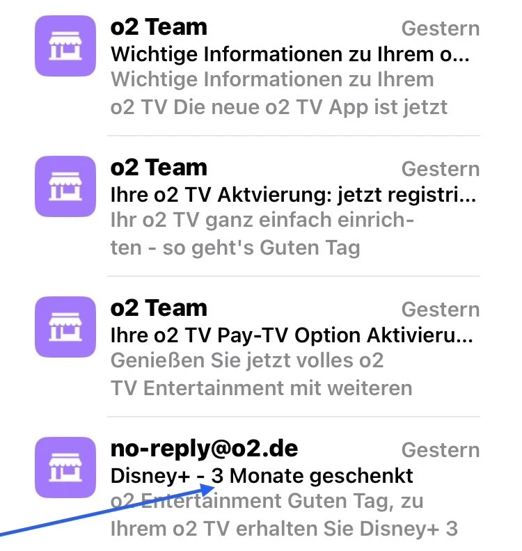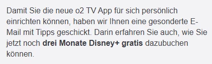 Ich habe zwar noch 2 Emails von O2 bzgl. o2 TV App bekommen, aber nirgends wird etwas von Disney+ erwähnt noch finde ich irgendwo eine Option um Disney+ 3 Monate gratis zu bekommen.