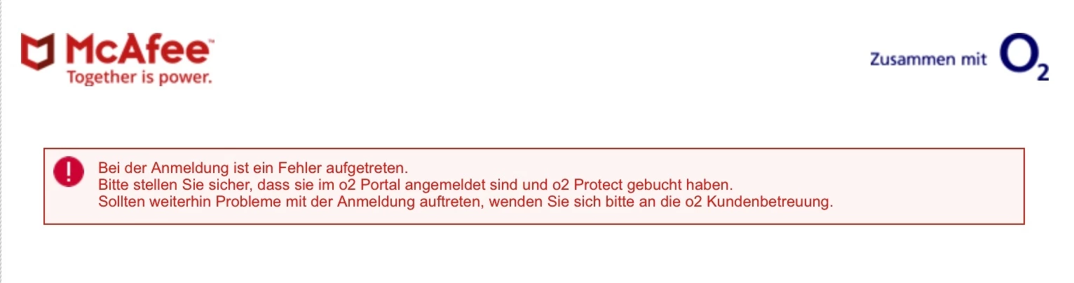 Beim Einloggen auf meinem O2 Protect Konto erscheint eine Fehlermeldung: