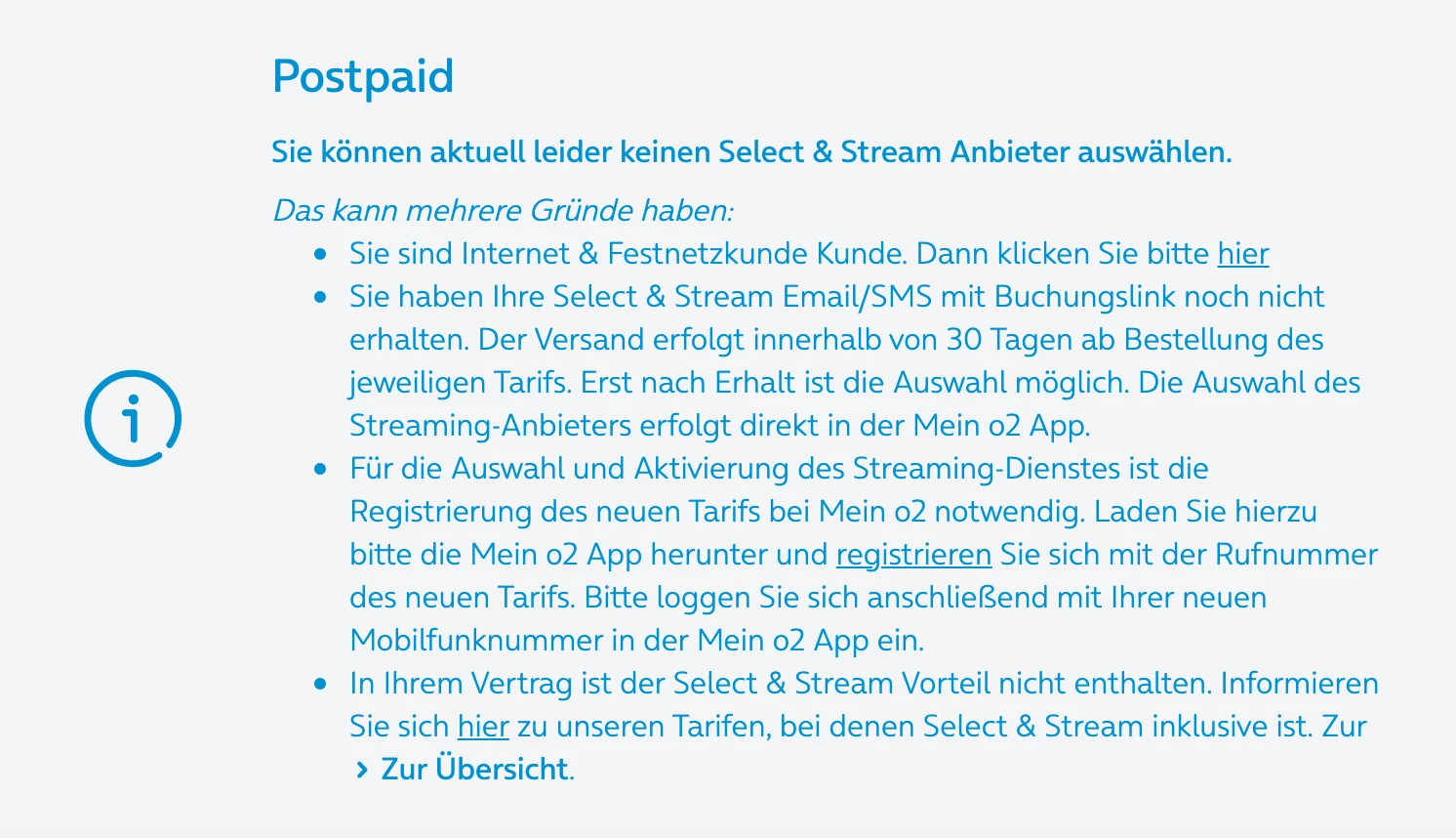 In der “Mein o2 App” wird mir Select and Stream angezeigt, aber wenn ich es anklicke, kann ich keine Auswahl treffen, durch den Link die mir Larissa zugeschickt hat, geht es leider auch nicht.
