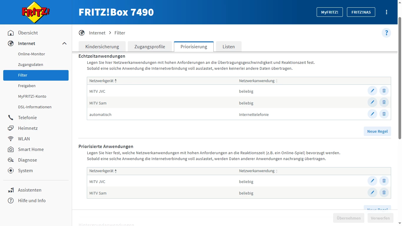 Dann unter Internet → Filter → Priorisierung für dieses Gerät eine Echtzeitanwendung und eine Priorisierte Anwendung einrichten: