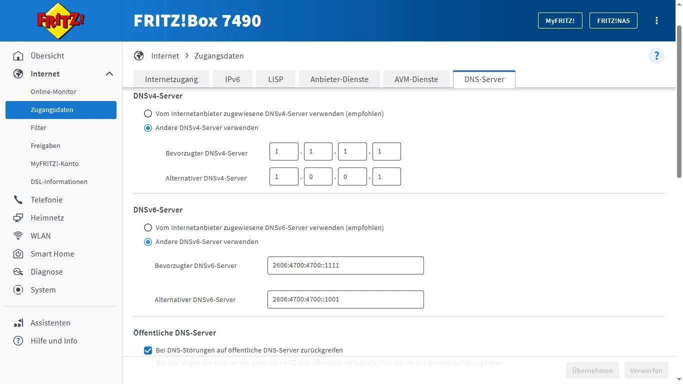 Ich habe bei mir nun die Server von Cloudflare bei Internet → Zugangsdaten → DNS-Server eingestellt: