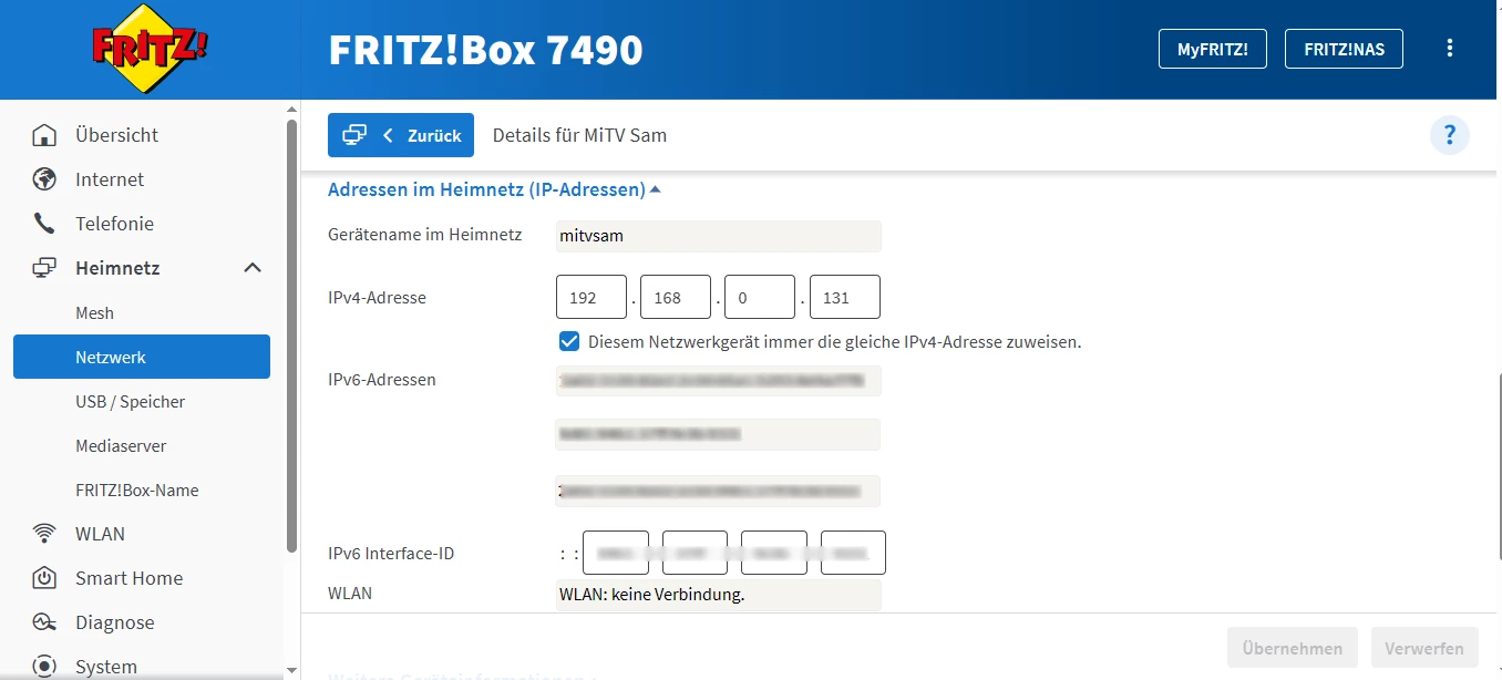 Den ersten Hinweis darauf bekam ich dadurch, dass es keine Probleme gab, wenn das Endgerät direkt per LAN mit dem Router verbunden war (z.B. mein PC) oder ich auf dem Handy die Mobilfunkverbindung ins Netz von o2 genutzt habe. Sobald aber das WLAN involviert war, begannen die Probleme. Denn dort muss man aufgrund der Funktechnik mit höheren Latenzzeiten leben. Meine erste Handlung war es daher, die per WLAN verbundenen Geräte (meine beiden miTV-Sticks an den Fernsehern) im Router zu priorisieren. Bei einer Fritz!Box gibt man dazu den Geräten zuerst eine feste IP-Adresse: