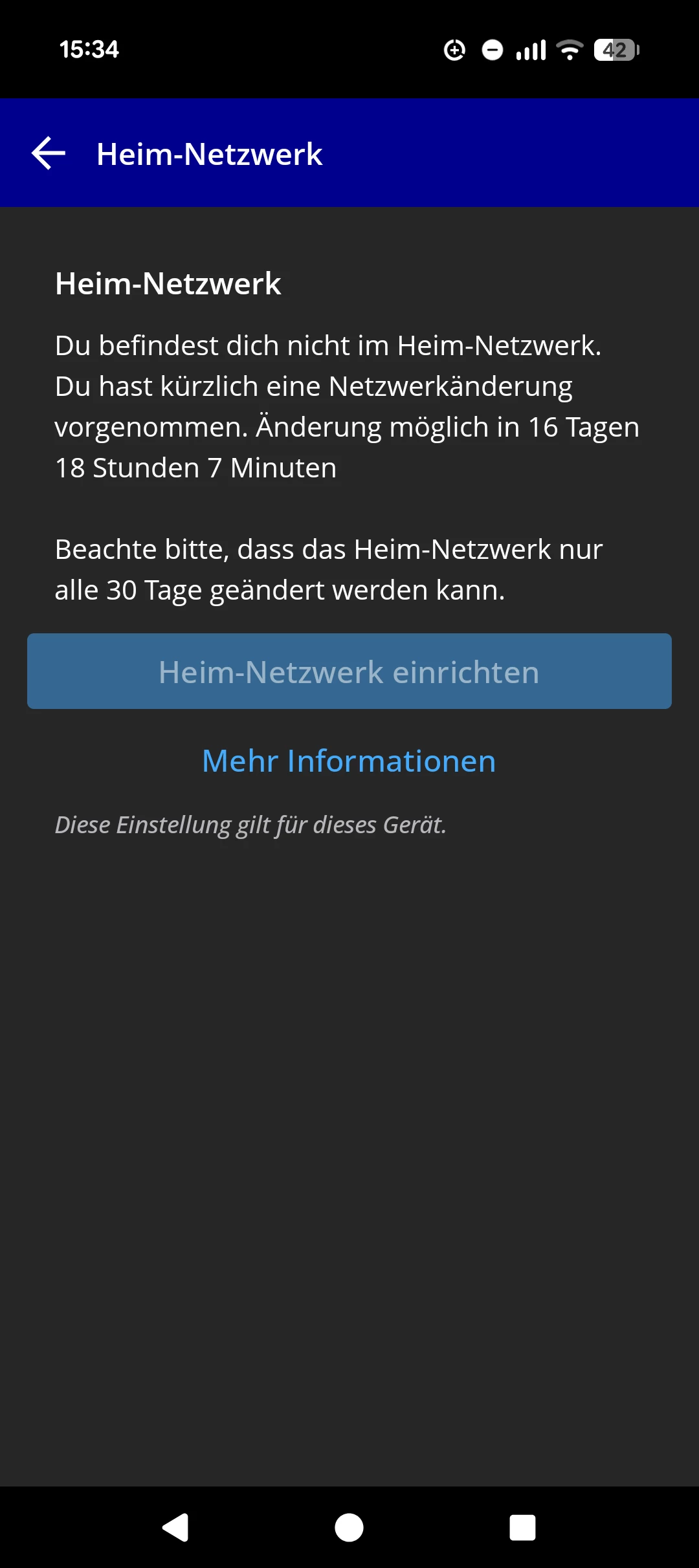Heimnetzwerk bis jetzt immer noch nicht zurückgesetzt. Solange kann ich einfach nur abwarten. App sagt, ich kann in 17 Tagen erst wieder wechseln.