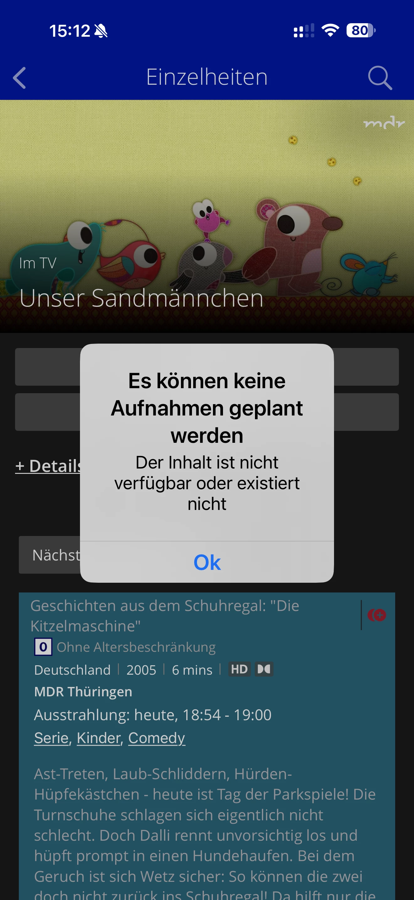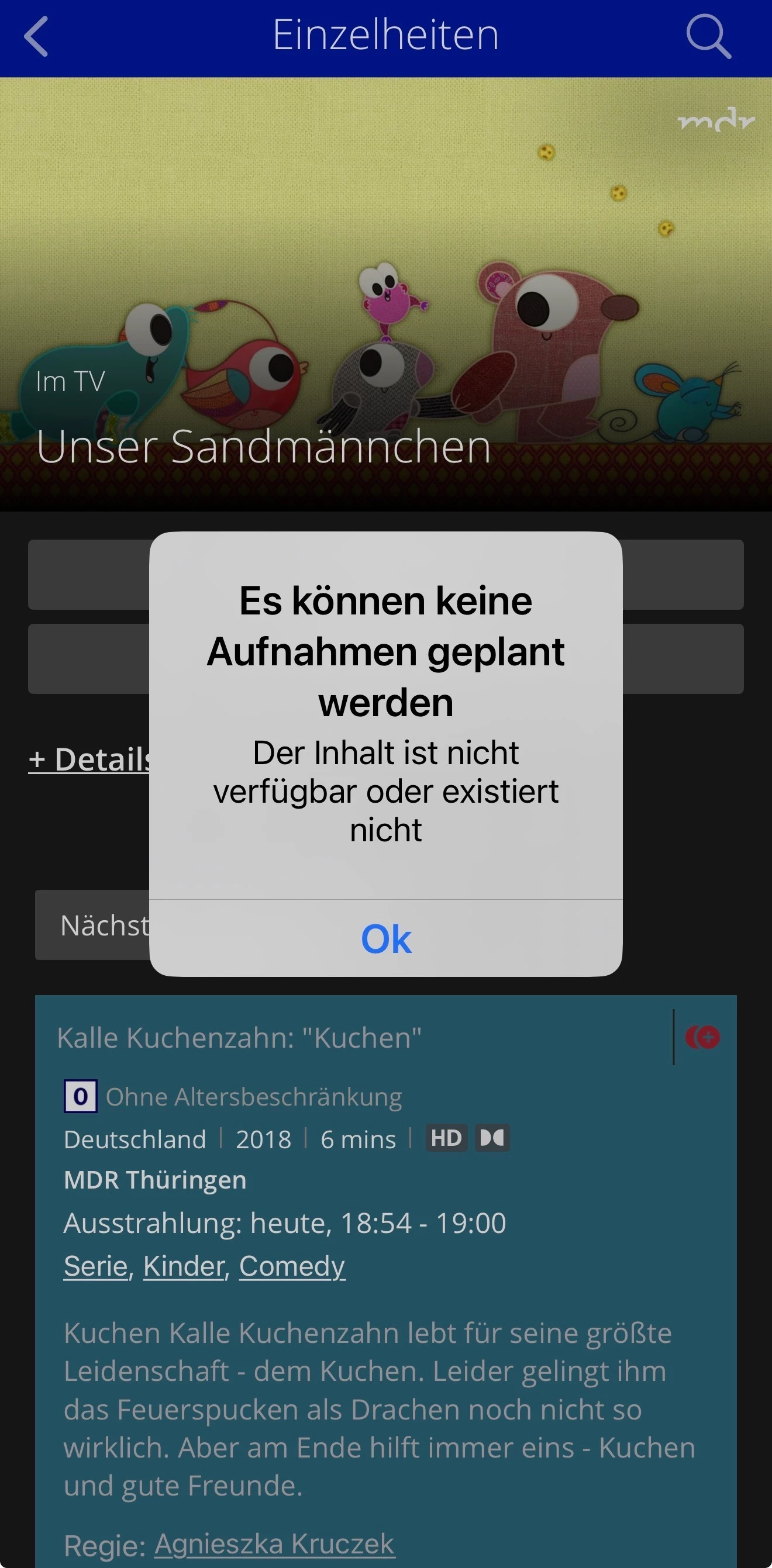 @o2_Antje Beispiel: jeden Abend Sandmännchen 18:54 Uhr auf mdr .keine Aufnahme mehr möglich seit neuer O2 TV App.