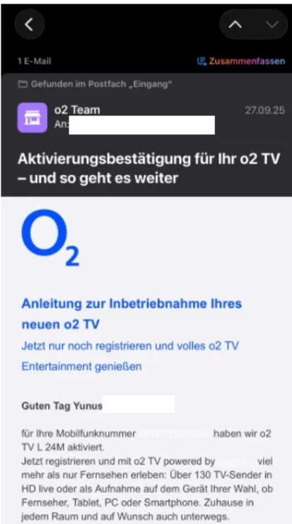 Ich habe am 27.09.2025 die Mail bekommen: 'wir haben o2 TV L 24M aktiviert'. In meiner App steht auch der 27.09.2025 als Startdatum.