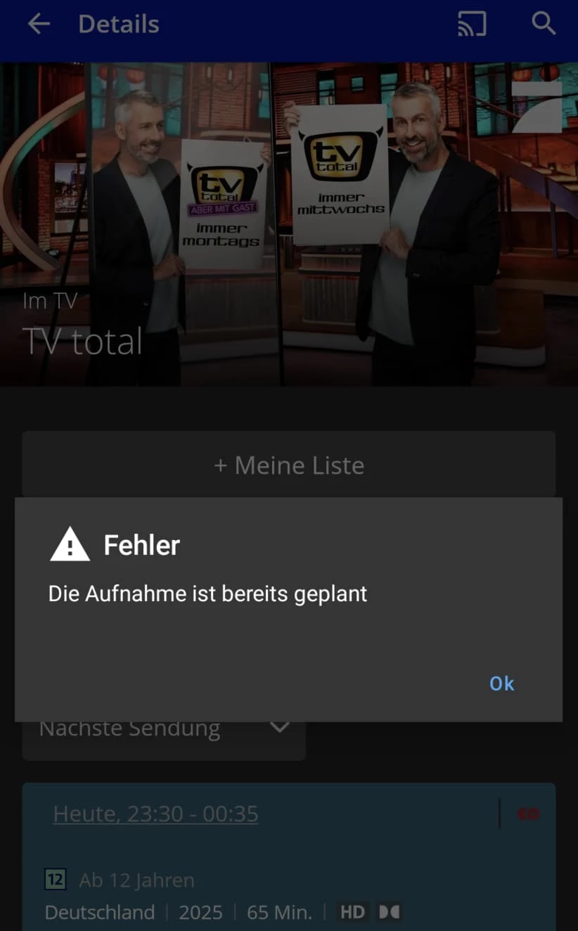 Für mein Empfinden hätte die App eigentlich da direkt meckern sollen, denn ich hatte die Serienaufnahme gestern ja schon programmiert. Das passierte aber nicht und erst nach dem zweiten mal Serienaufnahme einrichten kann die selbe Fehlermeldung wie aus dem Screenshot, den ich gestern gepostet hatte. Alles sehr ungewöhnlich.