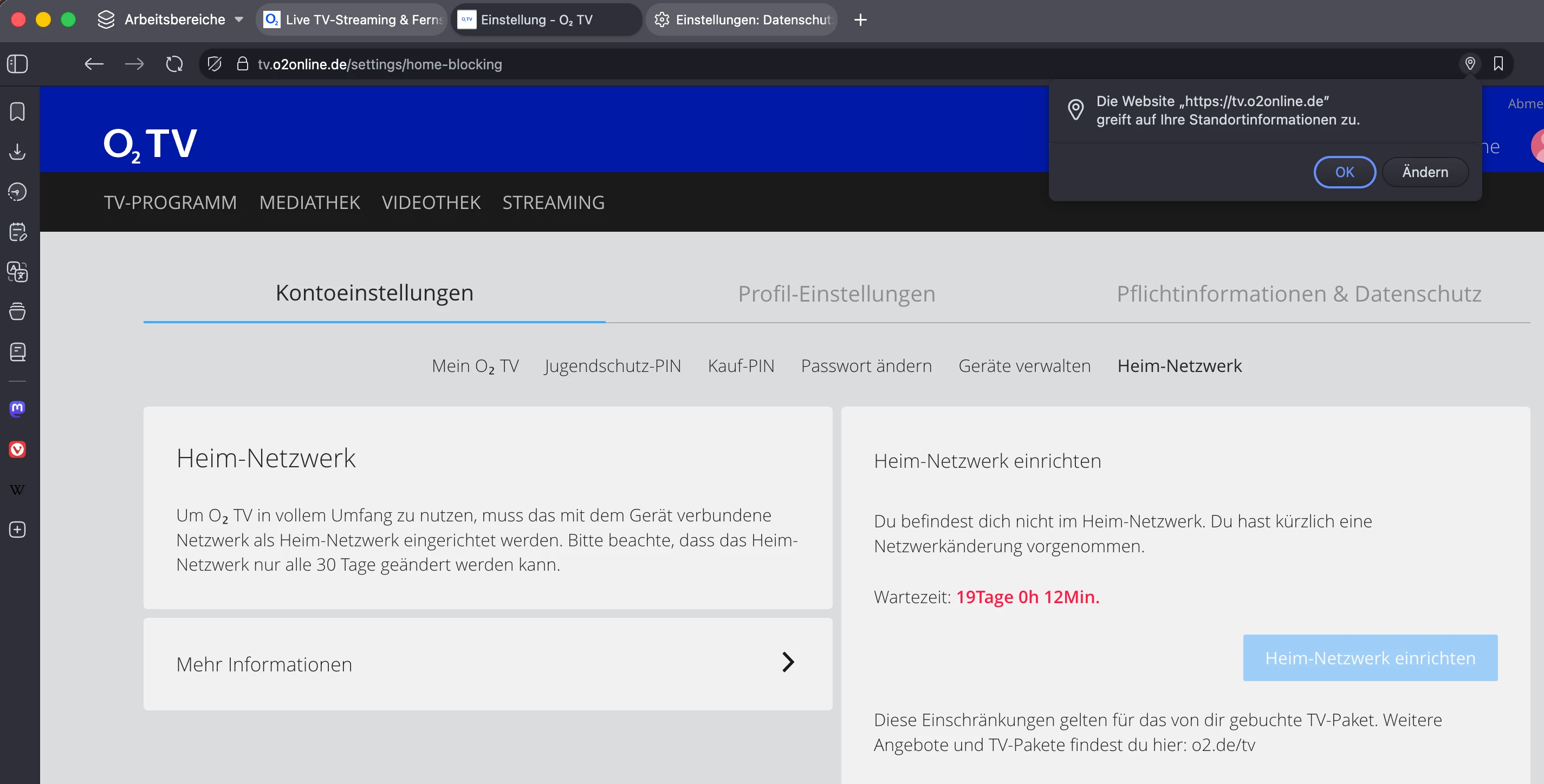 wenn ihr über einen PC/Webbrowser schaut, stellt bitte auch sicher, dass die Standortfreigabe im Browser für die o2 TV App aktiviert ist.