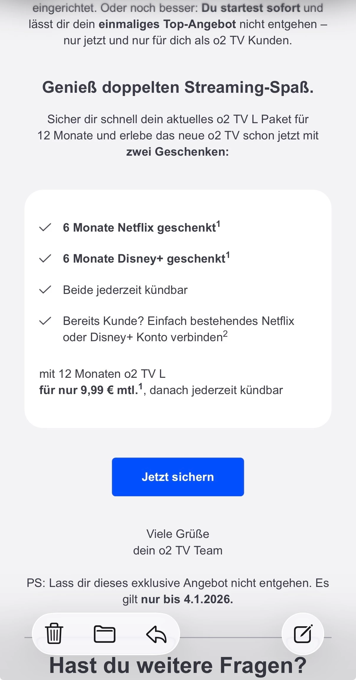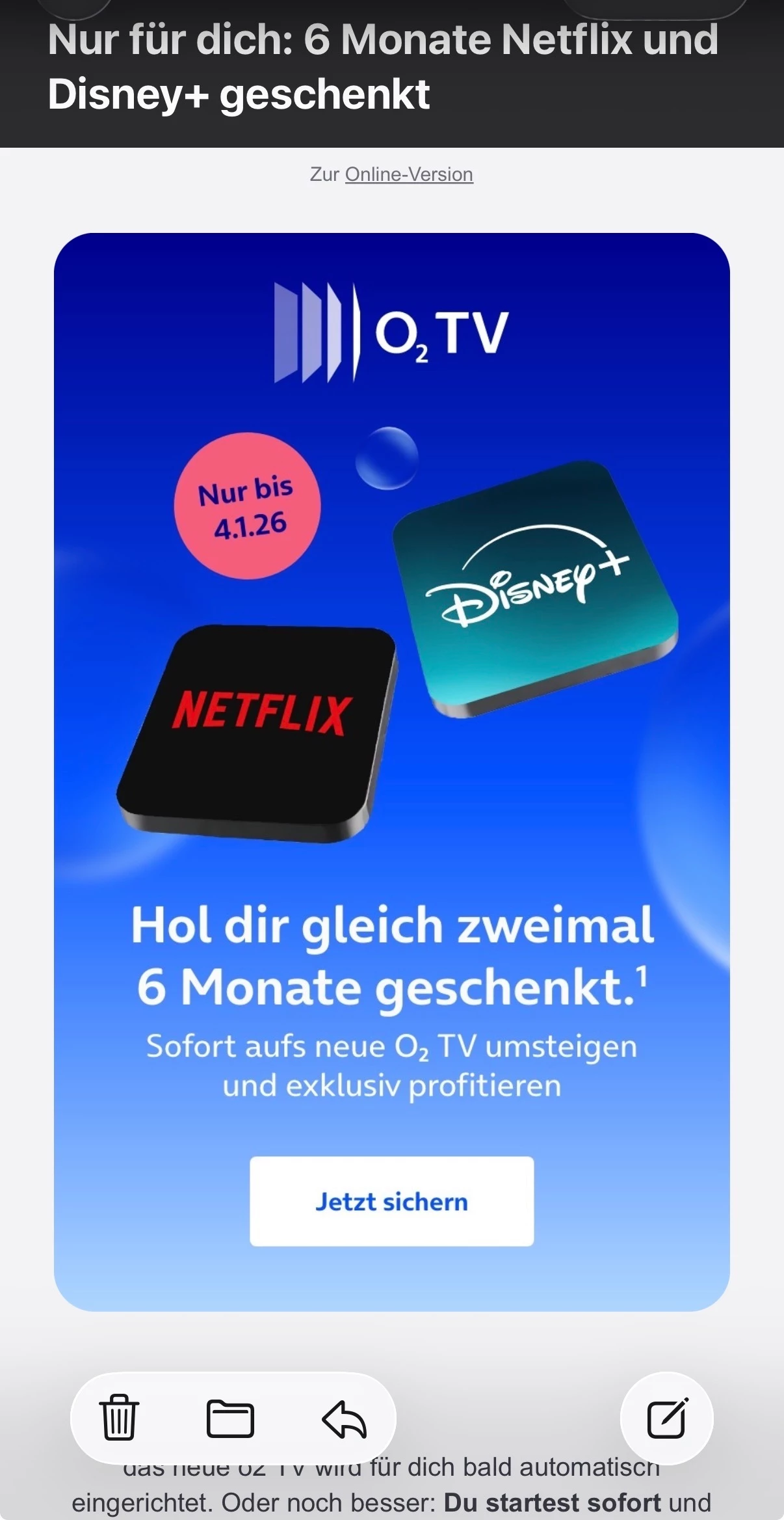 Die 14 Tage sind um und ich habe immer noch nicht mein vertraglich zugesichertes Angebot erhalten, dass auch Netflix 6 Monate kostenfrei ist bei frühzeitigem Wechsel zu O2 TV. Dies grenzt an Betrug und Verbrauchertäuschung. Seit über 3 Monaten warte ich jetzt auf eine Lösung. Um den Verantwortlichen die Erinnerungslücken zu schließen, poste ich hier gerne nochmal einen Screenshot aus der Mail mit dem Angebot, welches ich im guten Glauben angenommen habe.