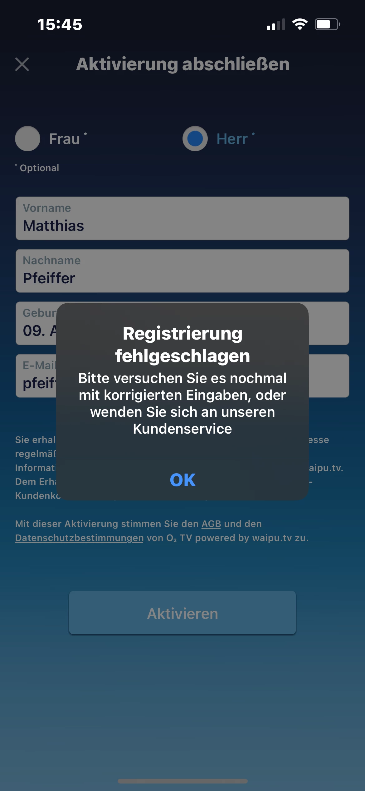 TV sowie IPhone 13. Die App gibt meine Daten vor und meint dann die wären falsch. Neu eingeben oder Kundendienst. Nach Neueingabe dasselbe Spiel