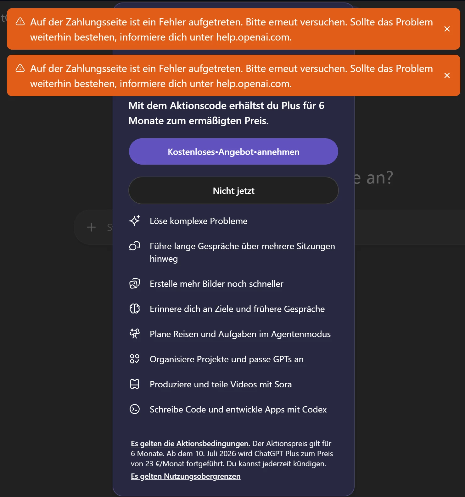Probleme beim Einlösen vom gratis ChatGPT für 6Monate