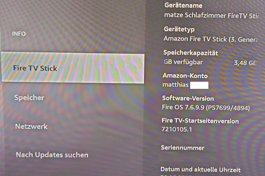 Ich nutze einen FireTV Stick der dritten Generation, was wird da bei dir angezeigt? Interessant wäre zusätzlich noch die Speicherkapazität, also wie viel GB auf deinem FireTV Stick noch frei verfügbar sind.