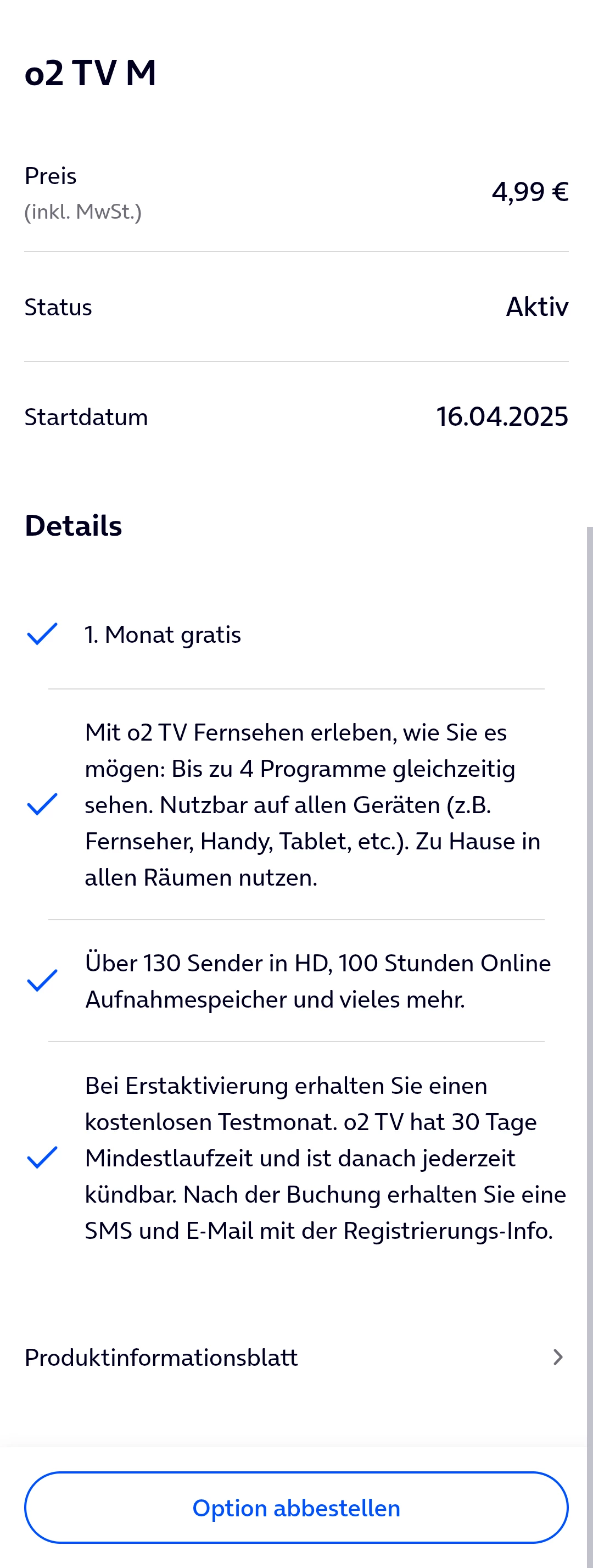 Nach der Deaktivierung von der o2 TV Priority Basic ist O2 TV M ist im Kundenkonto weiterhin vorhanden.