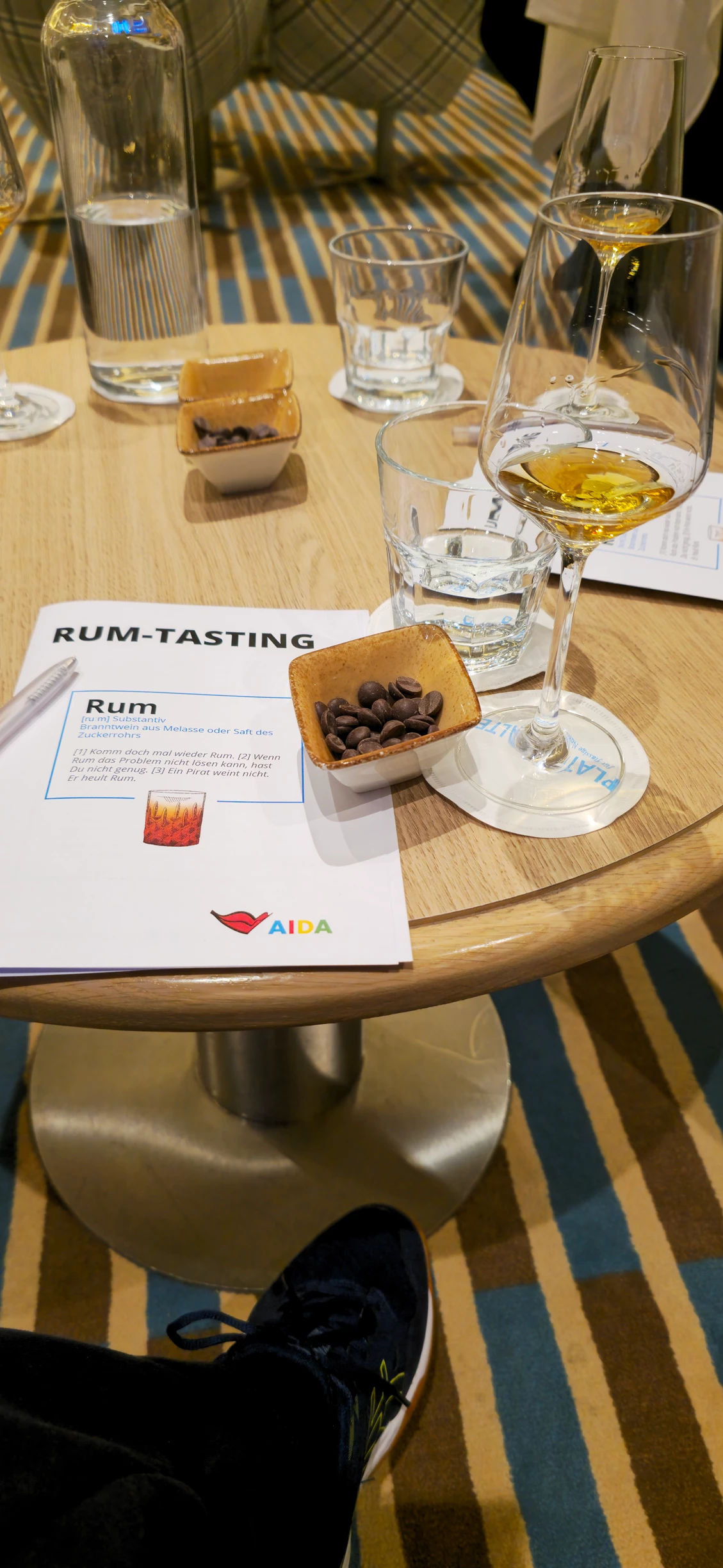 Bei einem Rum-Tasting konnte ich 5 verschiedene Rumsorten probieren und meine Anmerkungen dazu mitteilen und aufschreiben. Es war eine schöne Runde, die sich da zusammengefunden hatte. Zur Geschmacksneutralisation standen Schokolinsen und Wasser bereit. Als ich mich gegen Mitternacht auf den Weg in die Kabine machte, prüfte ich nochmal die nautischen Informationen auf dem Kabinen-TV. Ich sah, dass wir auf der Seekarte näher an Madeira als an den Kanaren waren. Es ging also voran!