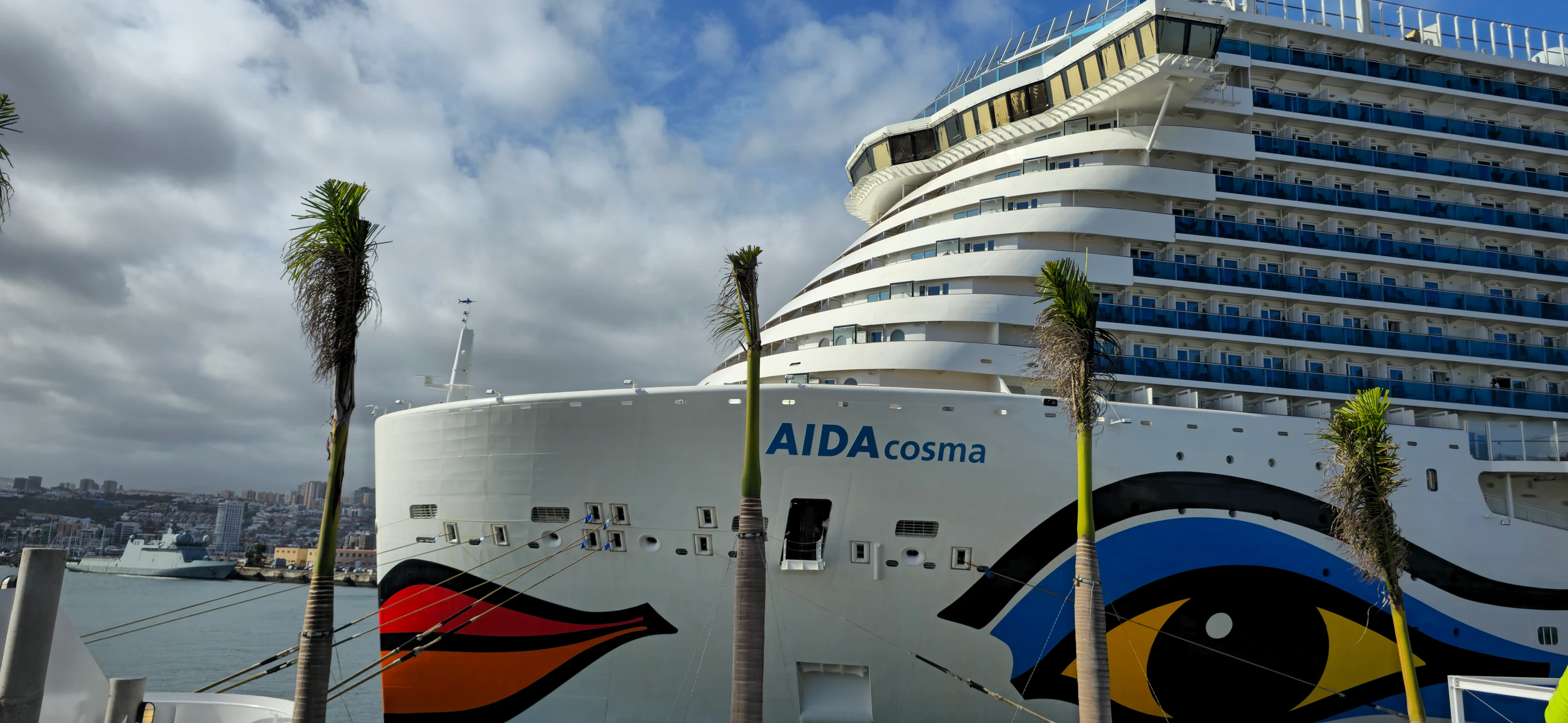 Das Schiff AIDAcosma wurde 2022 in Dienst gestellt, hat 20 Decks, mit 2732 Gästekabinen, ist 337 m lang, bei 8,6 m Tiefgang und kann eine Höchstgeschwindigkeit von 17 Knoten (31,4 km/h) leisten.