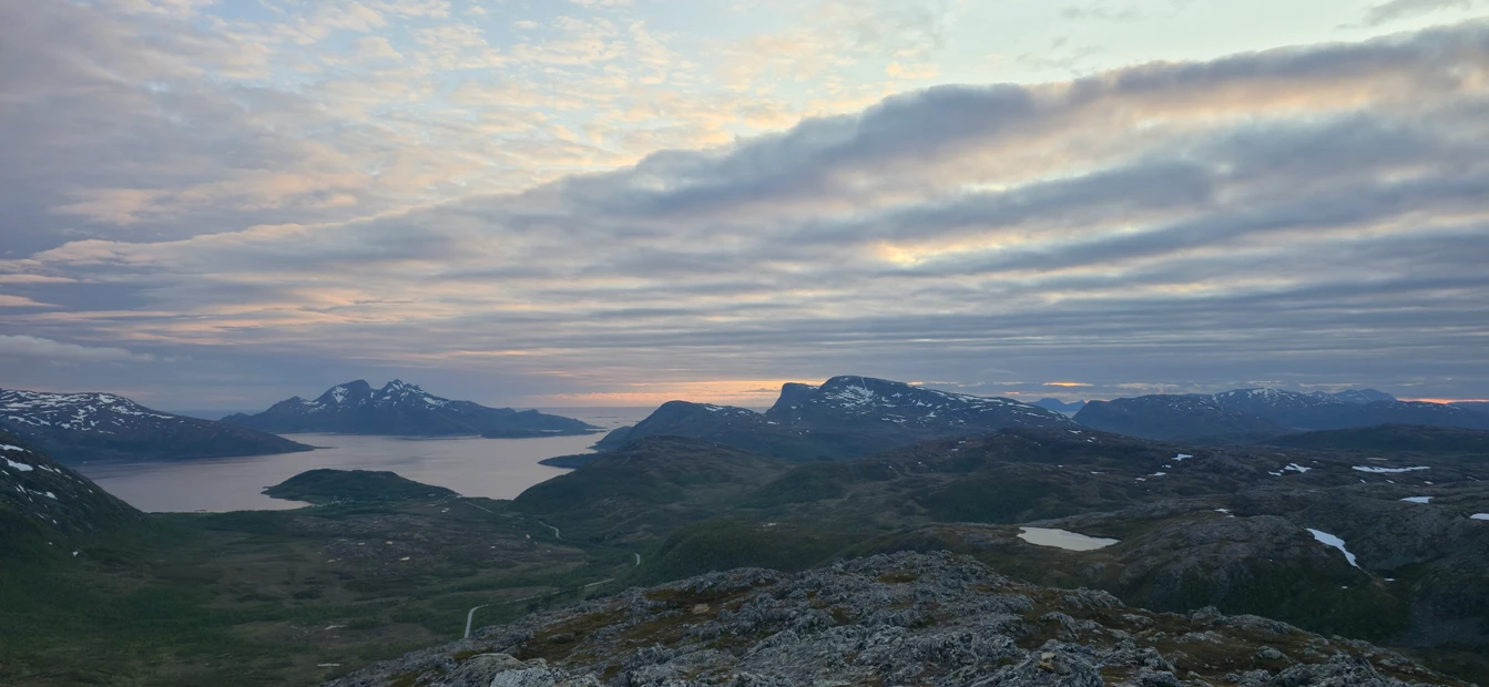 Kurz vor Mitternacht erreichten wir unseren Zielgipfel und warteten dort mit Tee, Kaffee, Gebäck und Sandwiches auf den neuen Tag. Leider ohne Mitternachtssonne, aber dafür mit einem tollen Ausblick. Es war schon ein ziemlich kurioses Gefühl, dass es nicht dunkel wurde. Und eine Wanderung so spät am Tag zu beginnen, das ist für mich auch neu gewesen. Dennoch war es ein Erlebnis, über Wiesen und Schneefelder zu laufen und am Ende mit einem tollen Blick belohnt zu werden.