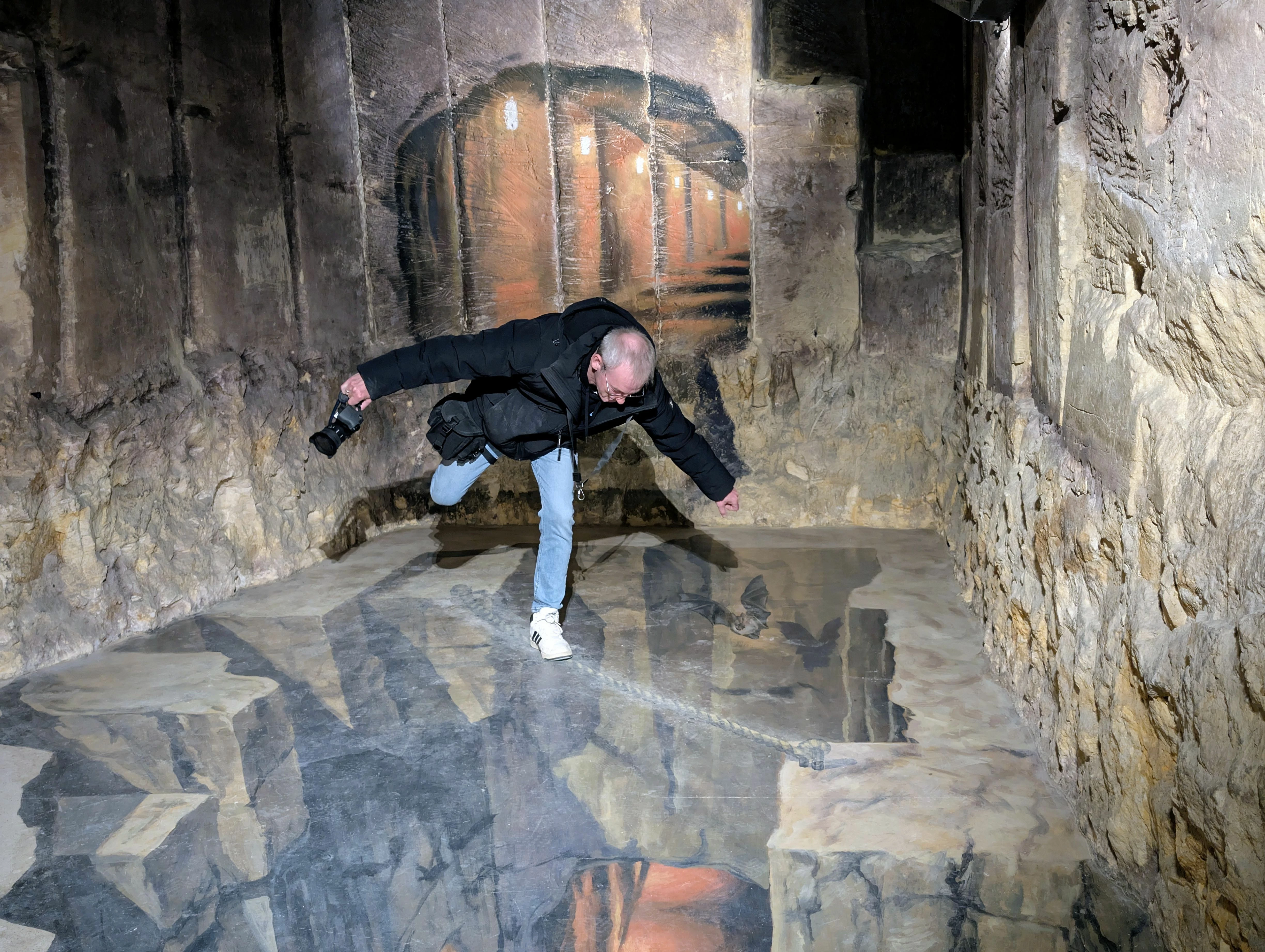 Am Ende angekommen wartet ein Bereich voller 3-D-Malereien. Boden, Wände, Decke – alles bemalt. Auf den ersten Blick wirkt das Ganze flach,