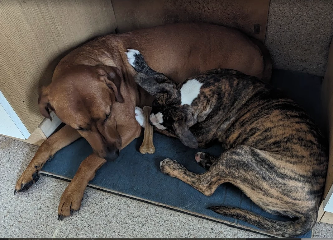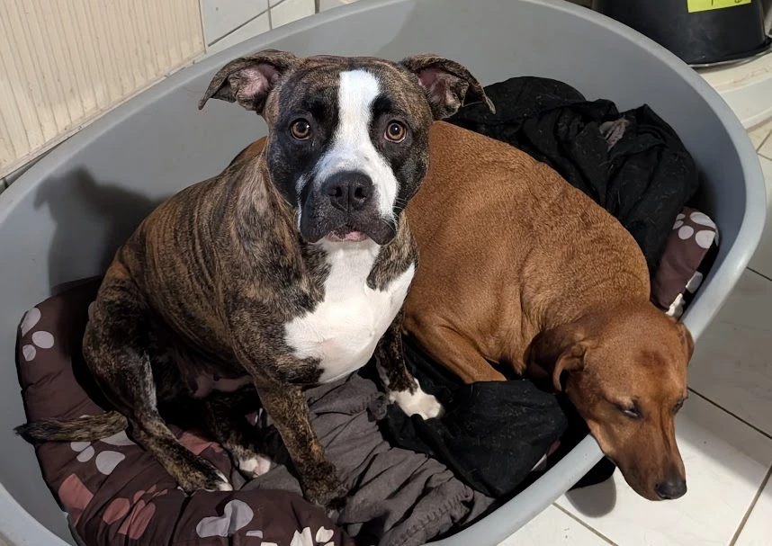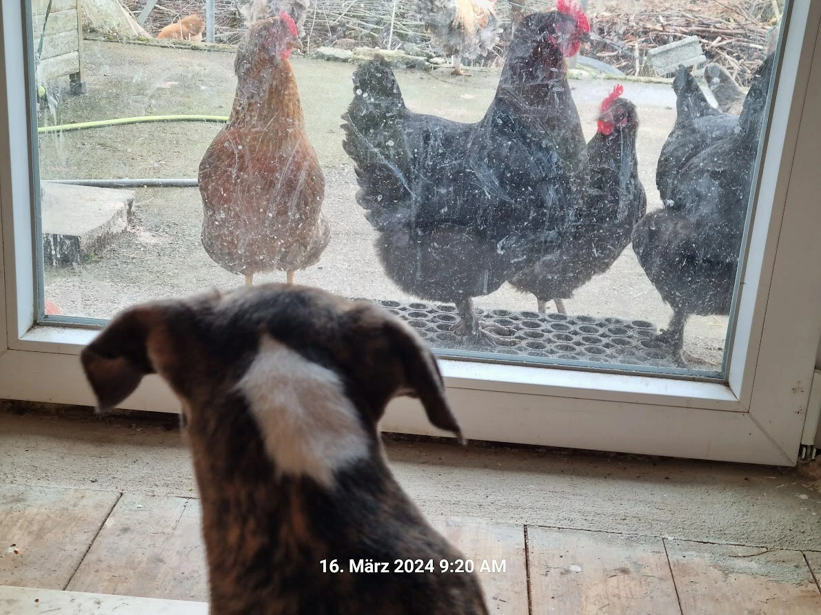 als ich vor 12 Jahren einzog, gab es eine kleine Familie an Boxer-Labrador-Mixe, Papa, Mama 2 Schwestern und nachdem Mutti und 1 Tochter leider zu krank waren und über die Regenbogenbrücke gegangen sind, haben wir einen Welpen bei Deggendorf geholt, das Erste Mal für mich mit einem jungen Hund