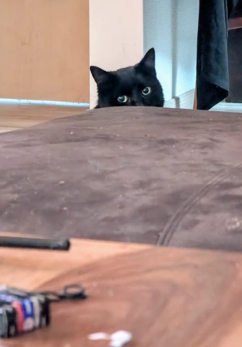 Kontext...Kater kam schmutzig durch die Katzenklappe..legte sich kurz aufs Sofa (deswegen auch so viel Fizzlkrams aufm seinem Platz), hat sich kurz gedreht und gestreckt, da er vorher vermutlich ne Stunde im Blumenbeet gepennt hat und jetzt was snacken wollte und ist dann dusselig vom Sofa gefallen und hat dann so verschämt über die Kante gelurkt 😄