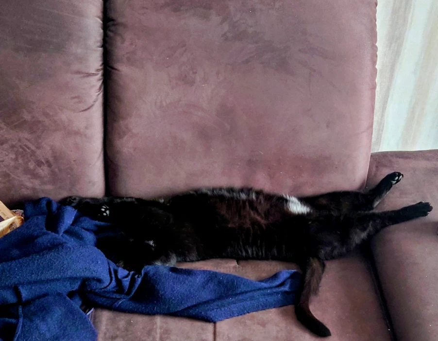 Heute morgen um 9 Uhr kam der Kater rein, hat sich die Plauze vollgeschlagen und liegt seitdem auf dem Sofa und pennt in seiner umgedrehten Superman Pose, unfassbar 😂 Erst dachte ich, er ist tot, aber man kann klar und deutlich erkennen wie er atmet...😄