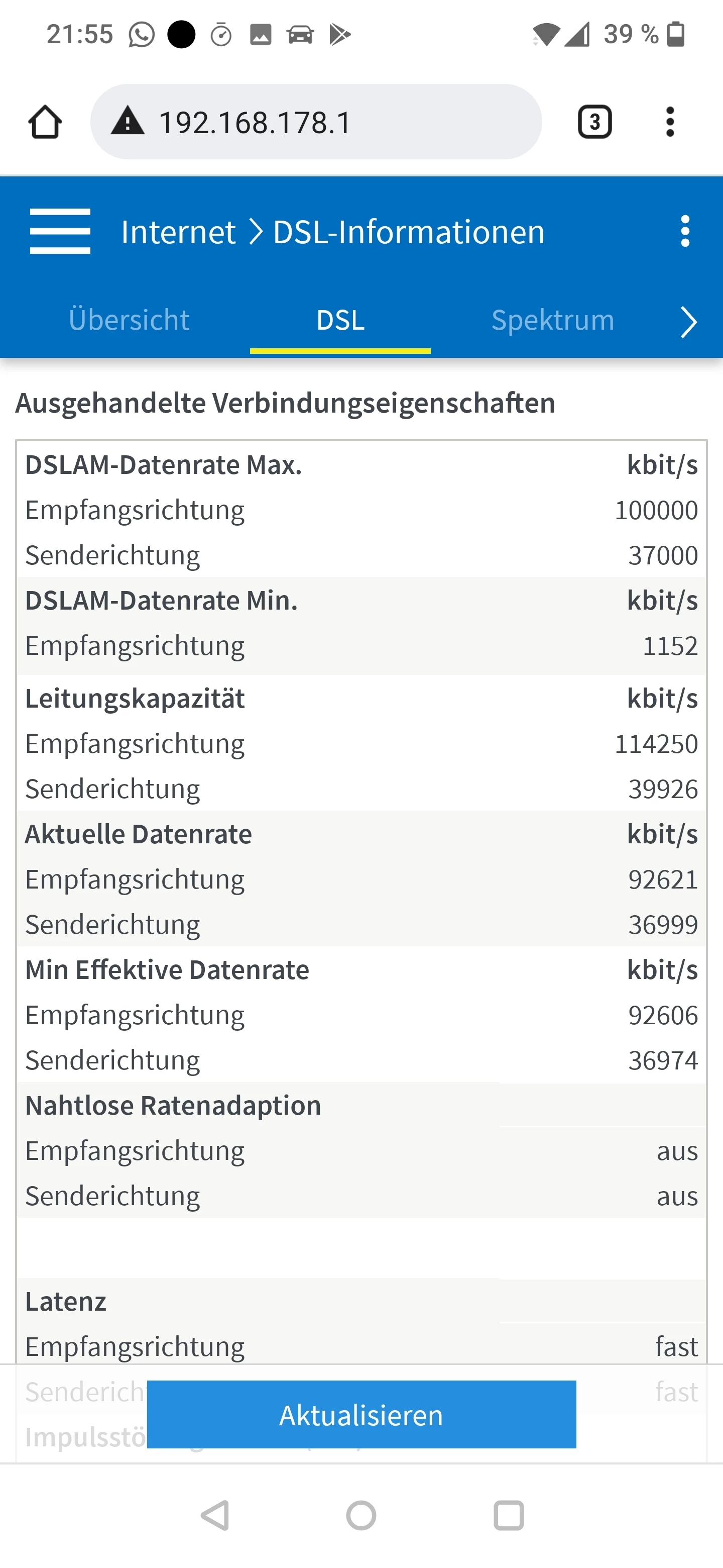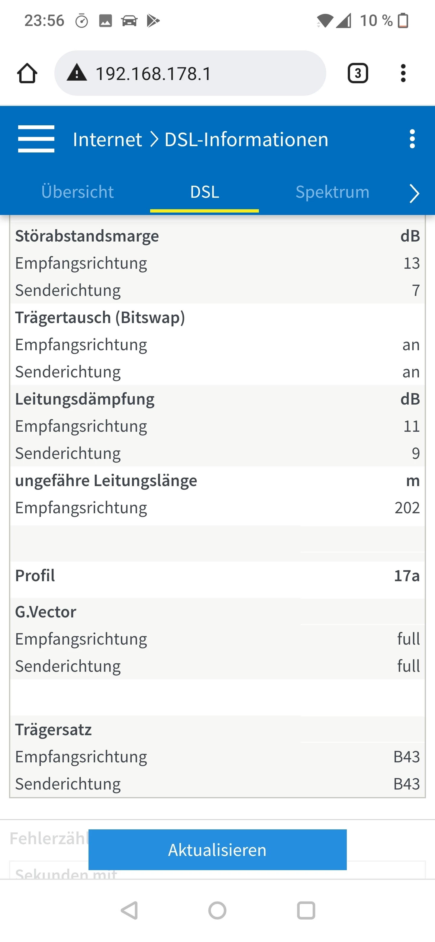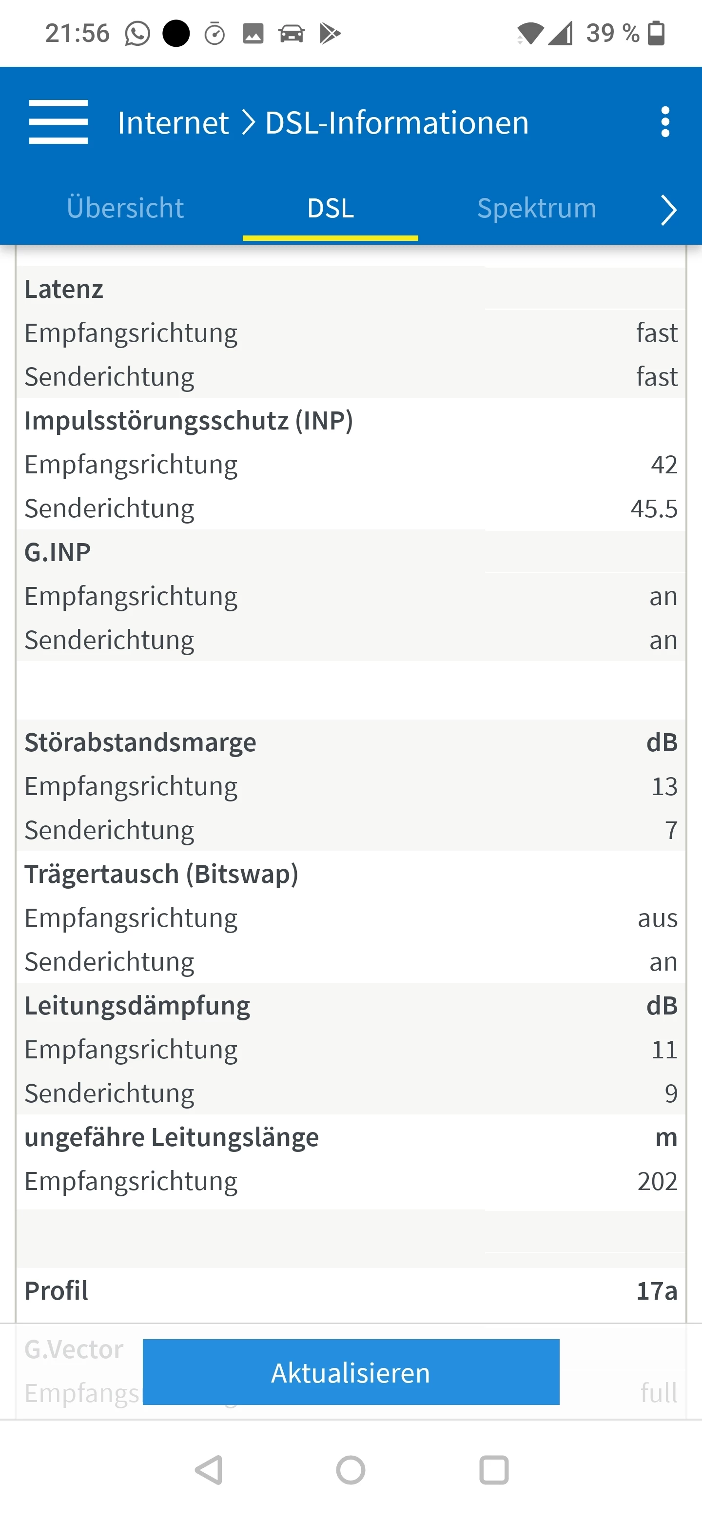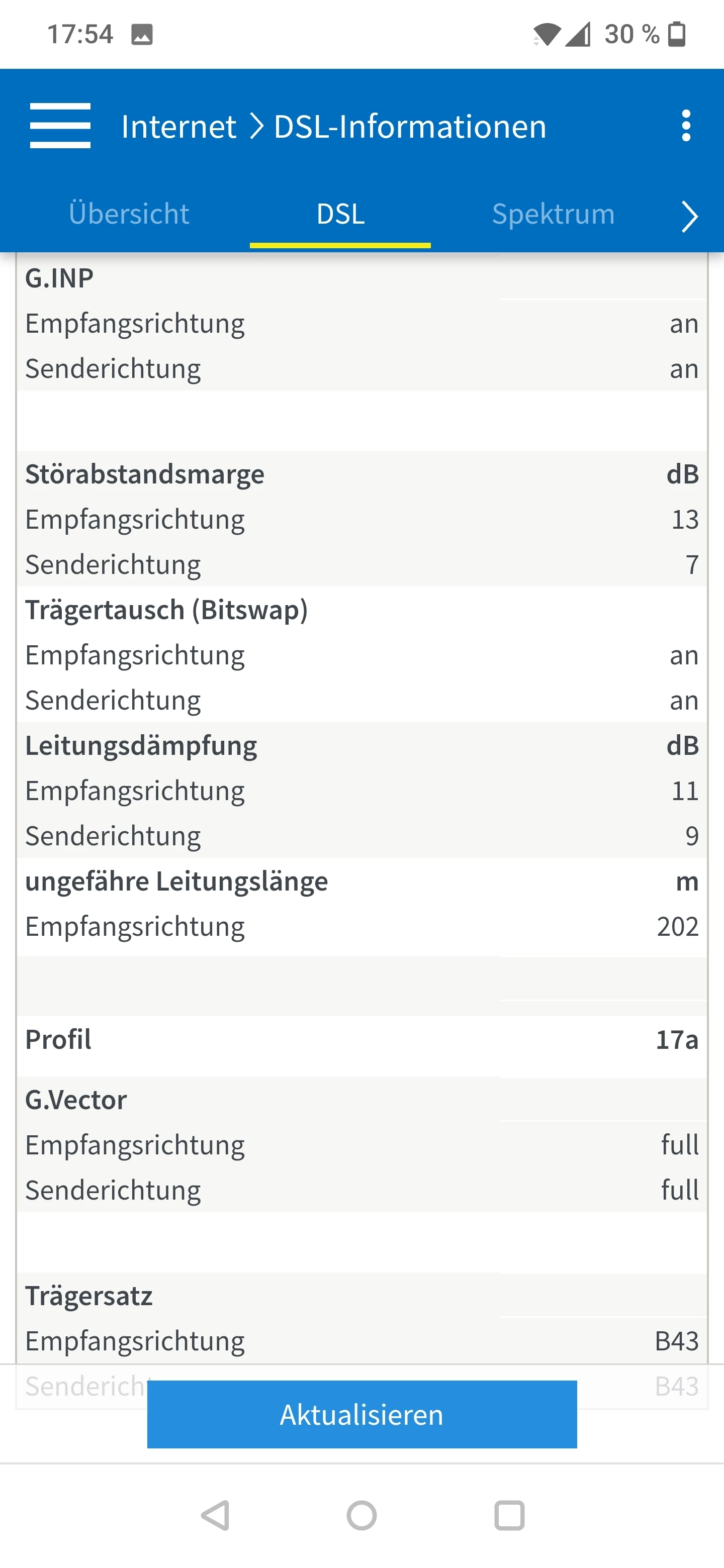 Ich vermute hier eher, dass ASSIA deinen Anschluss aufgrund der - grundsätzlch unzulässigen - Erdung mit einem Störprofil gedeckelt hat und nun 14 - 28 Tage bei stabilem Sync abzuwarten bleibt, ob sich dann hier etwas tut. Wie läuft denn die Fritzbox seit gestern nach der Entfernung der Erdung? Kannst du einen aktuellen Screenshot der Tabelle “DSL” posten?