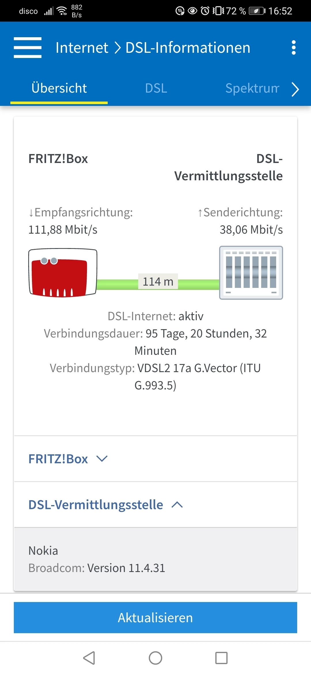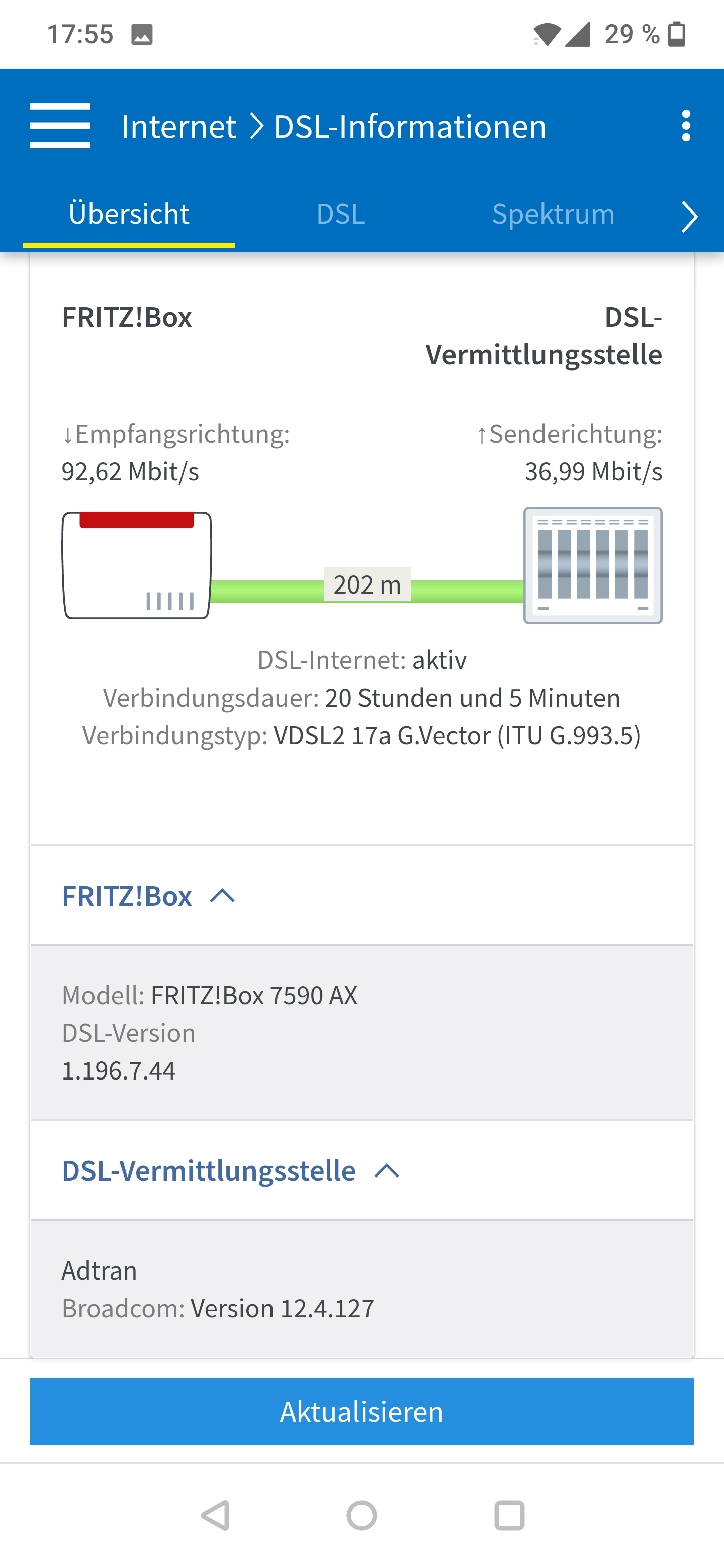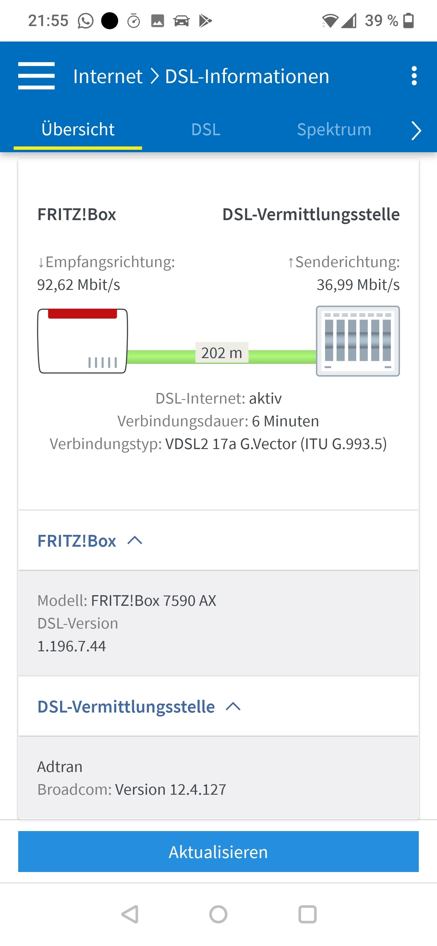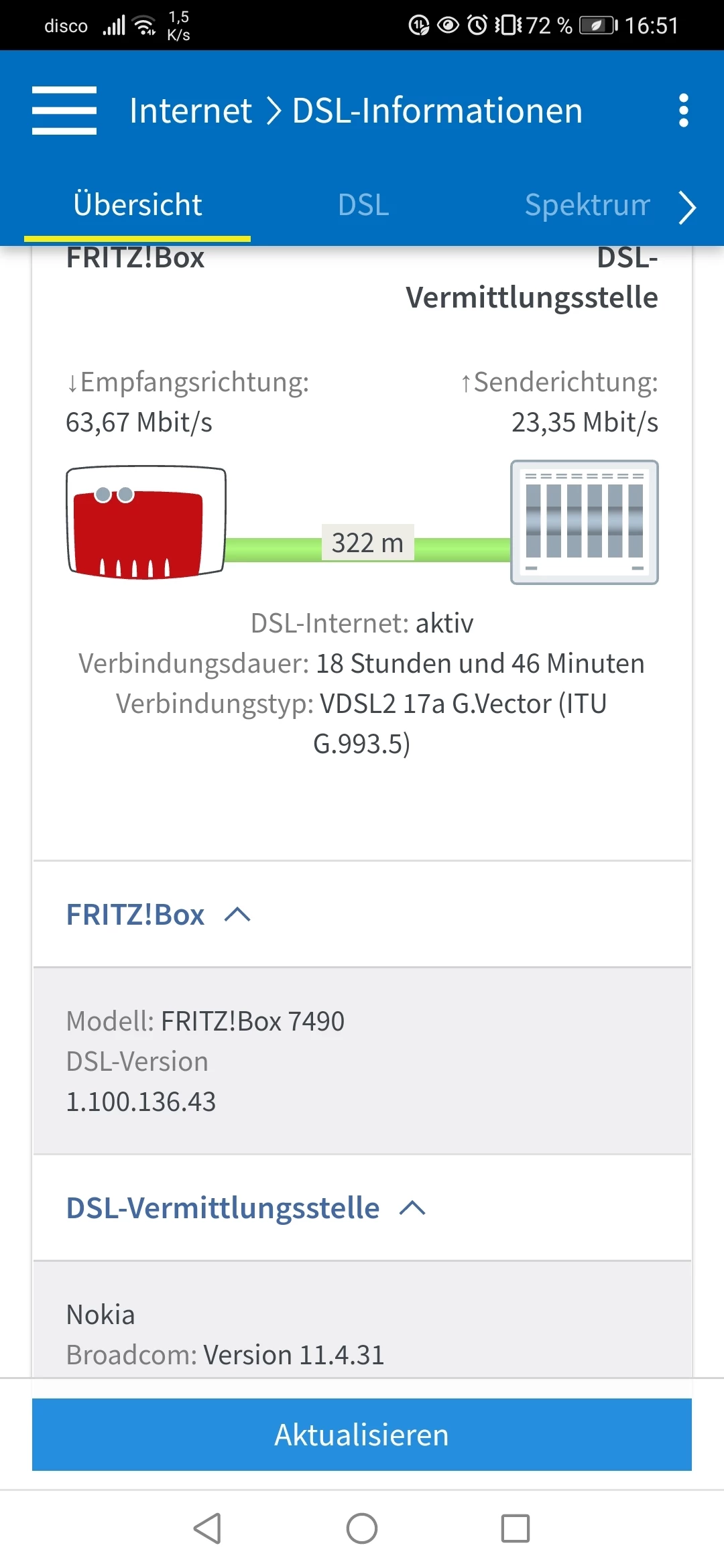 Ich vermute hier eher, dass ASSIA deinen Anschluss aufgrund der - grundsätzlch unzulässigen - Erdung mit einem Störprofil gedeckelt hat und nun 14 - 28 Tage bei stabilem Sync abzuwarten bleibt, ob sich dann hier etwas tut. Wie läuft denn die Fritzbox seit gestern nach der Entfernung der Erdung? Kannst du einen aktuellen Screenshot der Tabelle “DSL” posten?