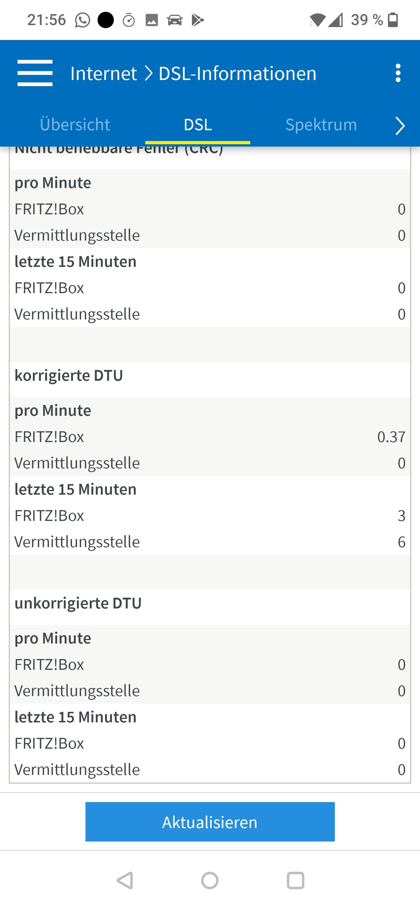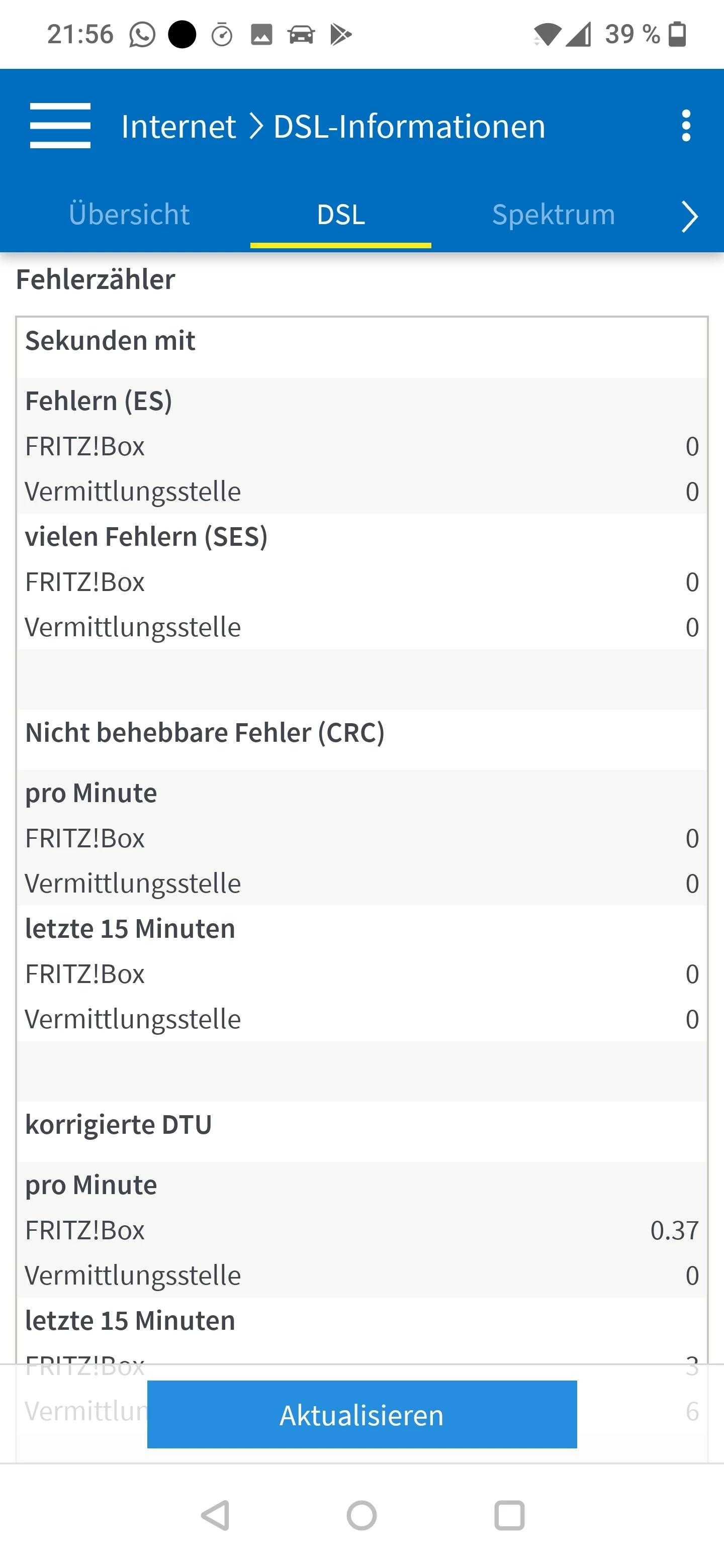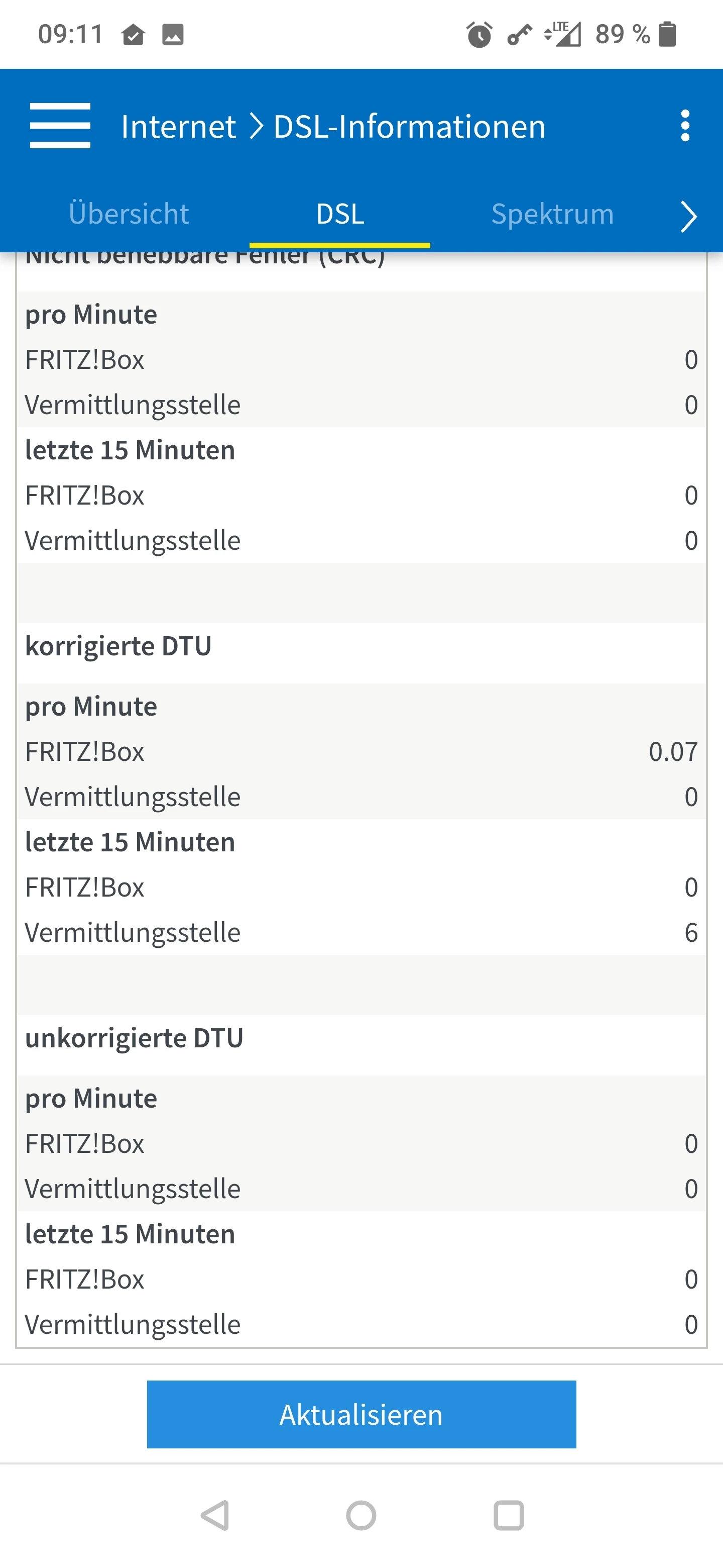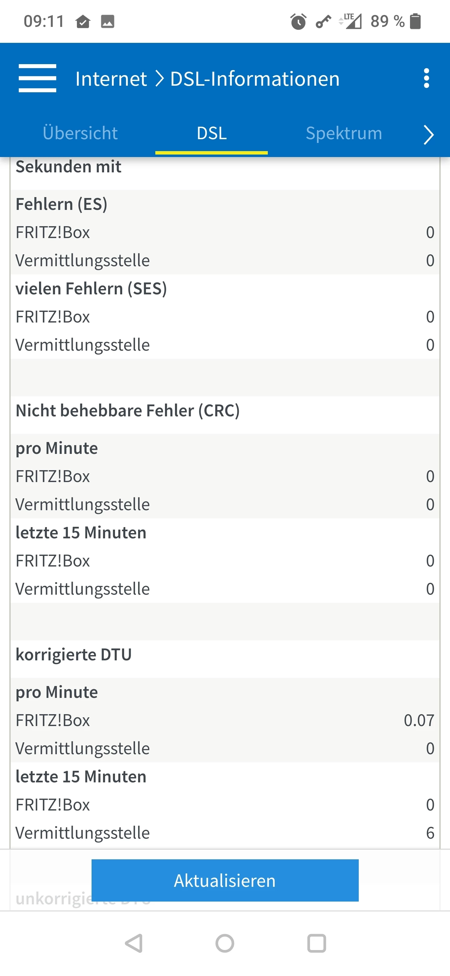 Es sind keinerlei Syncabbrüche oder CRC / ES Fehler vorhanden, auch keine unkorrigierten DTU Fehler. Lediglich eine kleine Anzahl von korrigierten DTU Fehlern