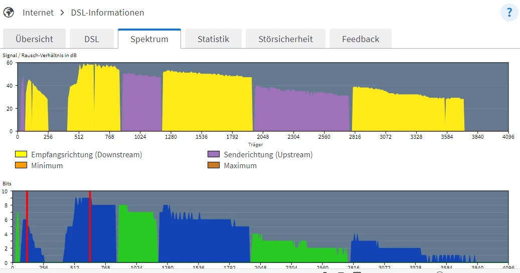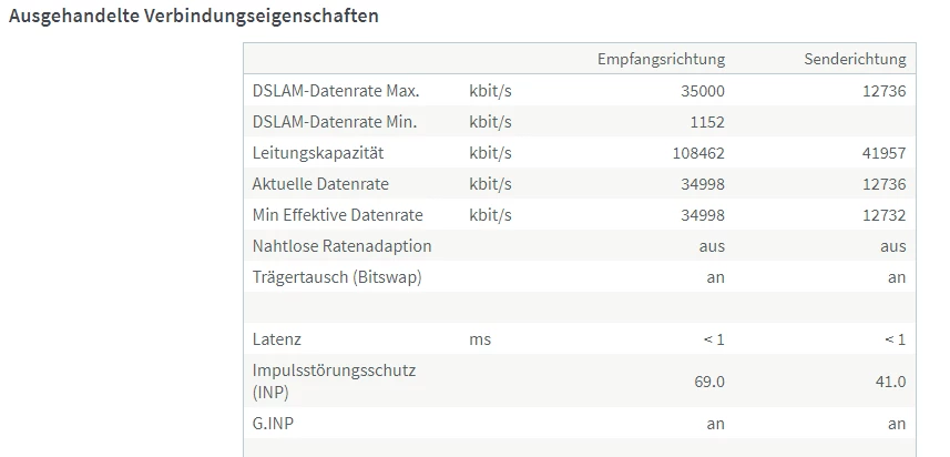Seit einigen Monaten verbindet sich DSL bei uns nur noch mit ziemlich exakt 35k (bei einem DSL 50k Vertrag). Früher waren es mit identischem Setup um die 50k. Die Leitungskapazität ist unverändert im Bereich von 108k, siehe Fritzbox-Screenshot anbei. Von O2 wurde es bereits durchgemessen und die Verbindung seit völlig gut mit guter SNR (ist sie auch, siehe zweiter Screenshot dabei).