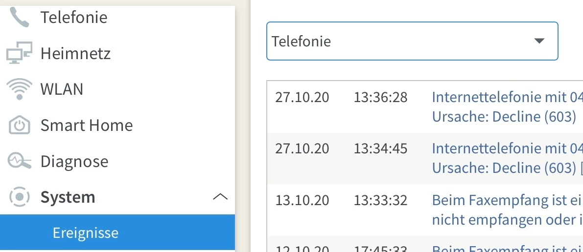 Und was steht in der Ereigniss Anzeige wenn Du nach Telefonie filterst. Was auffälliges?