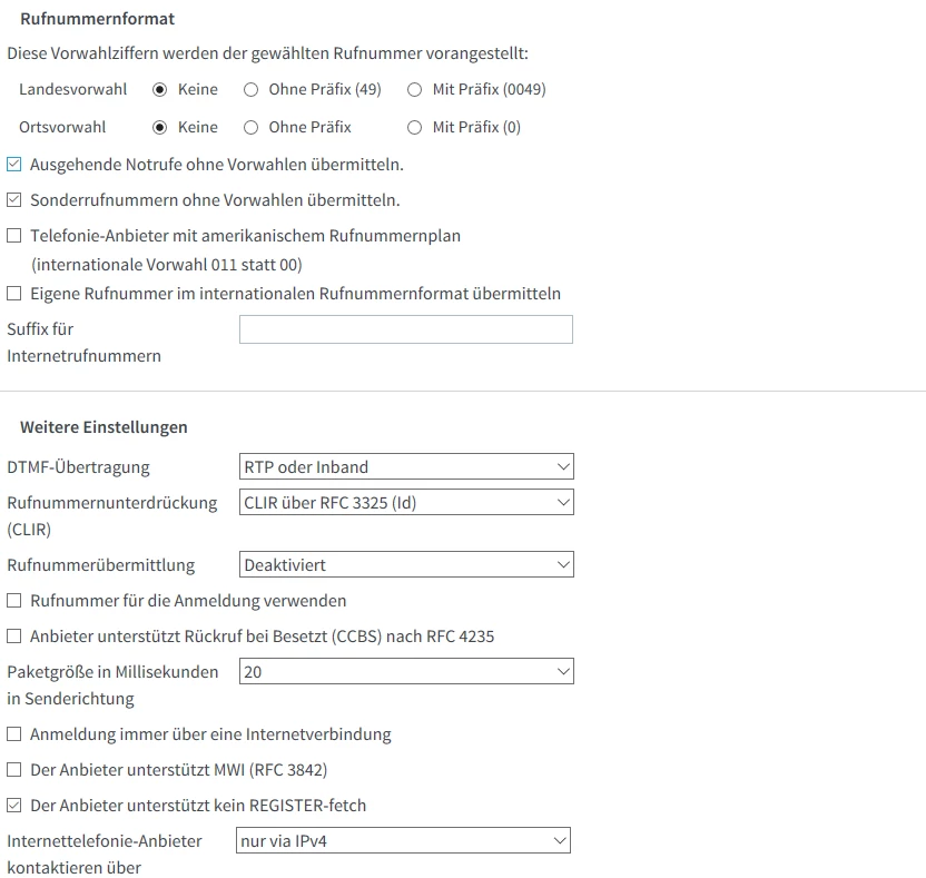 Oben links die Rufnummer ohne Vorwahl, rechts daneben bei interne Rufnummer auch ohne Vorwahl