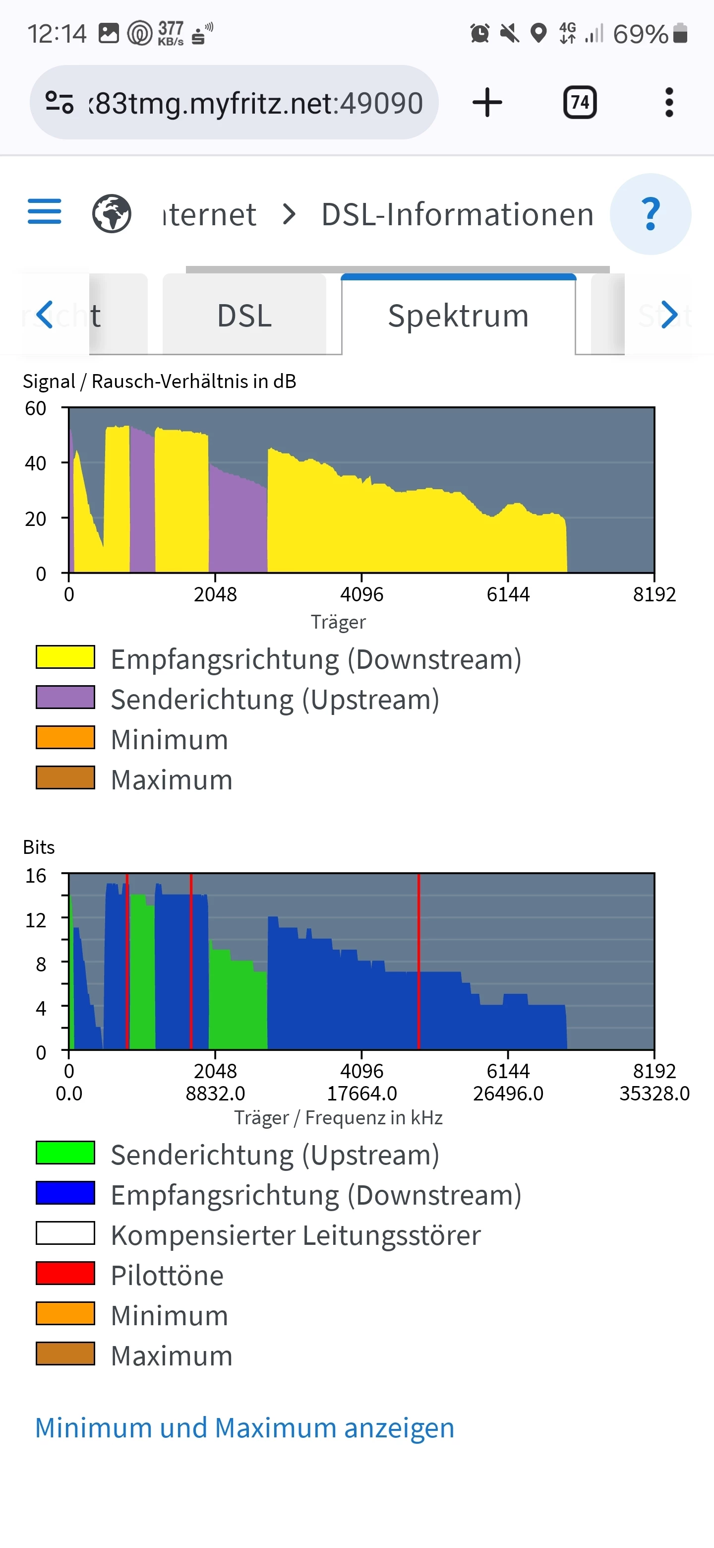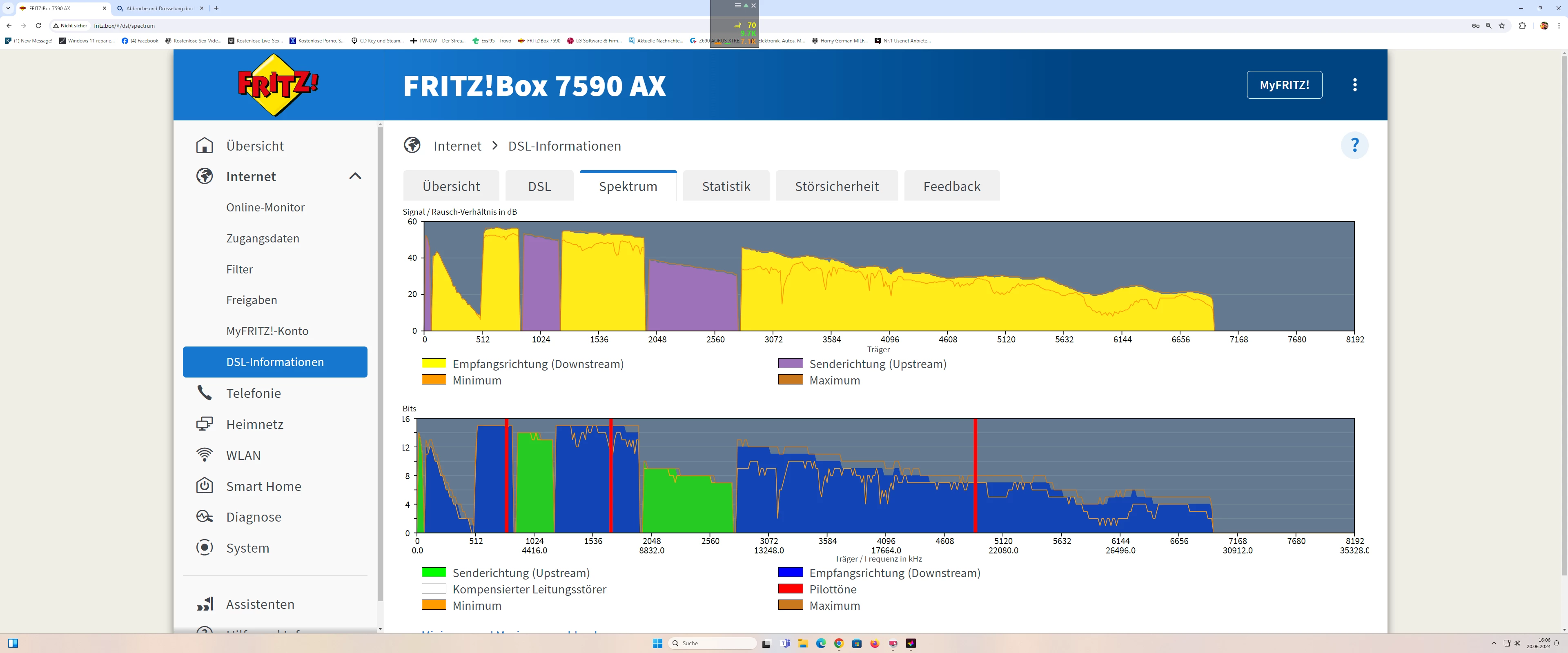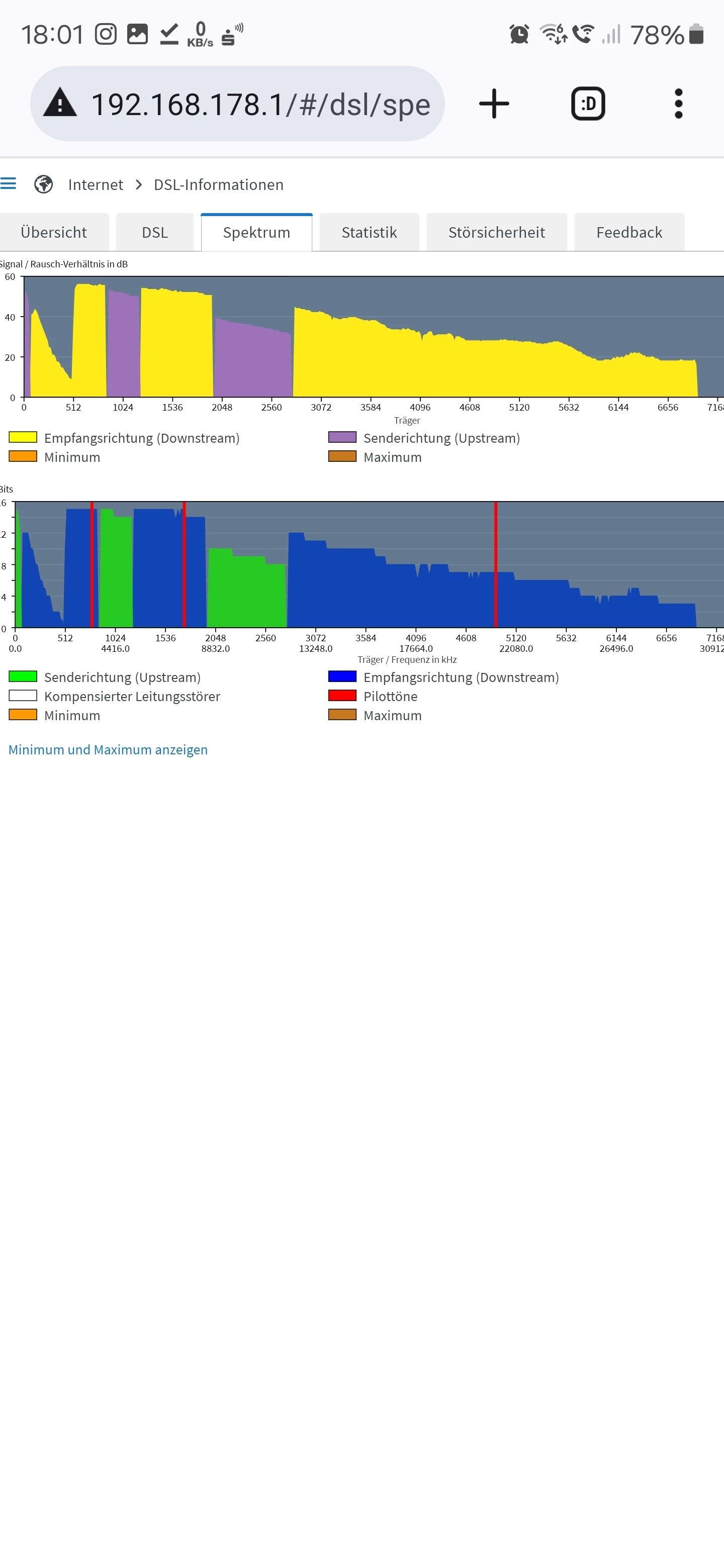 Das Spektrum sieht auch etwas ausgefranst aus (die Wellenlinien im grossen gelben Bereich rechts)… da Du einen Computer oder ein Tablet hast waere es schoen wenn Du nochmal groessere Screenshots von allen Tabs im Bereich Internet → DSL Informationen machen und posten koenntest, dabei bitte: