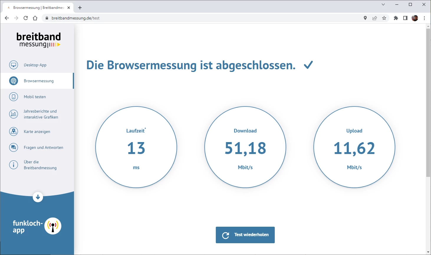 wir haben hier einen O2 my Home M (2020) Vertrag, der soweit ich weiss 50Mbit/s Download und 10Mbit/Upload beinhaltet.
