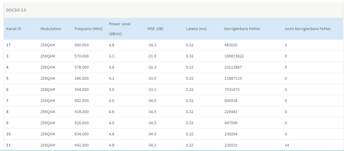 Dein Segment scheint massiv gestoert zu sein, 4QAM in allen Uploadkanaelen ist grottig, das Ziel von Vodafone ist glaube ich 64QAM fuer die DOCSIS3.0 Upload Kanaele und 4096QAM fuer die DOCSIS3.1 Upload-Kanaele (der /die bei Dir komplett fehlen, unklar ob wegen Stoerung oder ob die im Upload in Deinem Segment noch nicht aktiviert sind). Auch die Anazahl von 64QAM (statt 256QAM) Kanaelen im Download sieht nicht gut aus.
