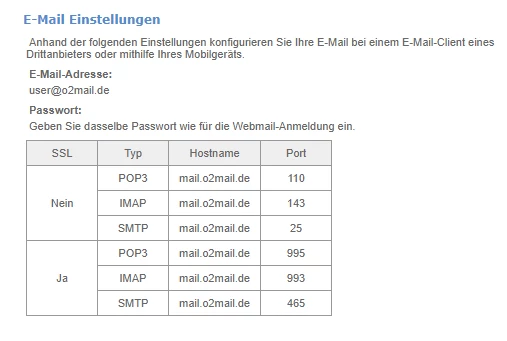 Für die Einstellungen am Handy gibt es nur die oben genannten Eisntellungen. Hast du es hier mit der “o2mail.de” Adresse gemacht ?