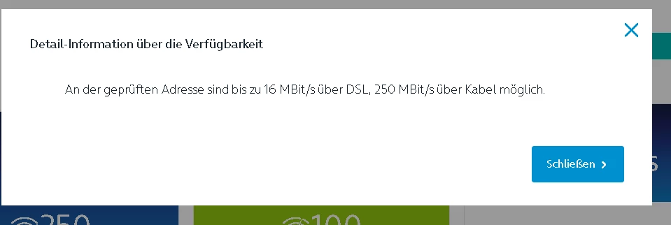 Auch ein Blick auf unsere Internet Verfügbarkeit ist sinnvoll, nach einem Klick auf das kleine “i” wird je nach verfügbarer Technologie angezeigt, welche Geschwindigkeiten möglich sind.