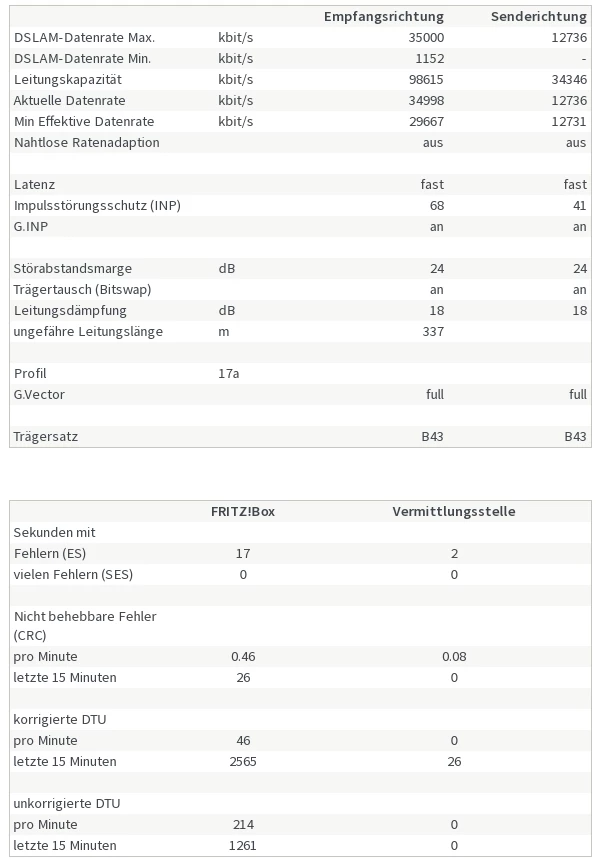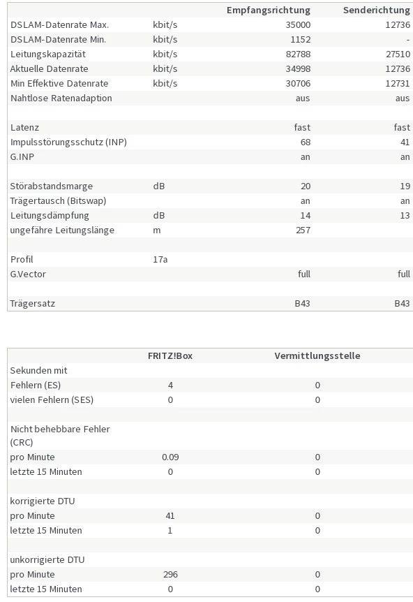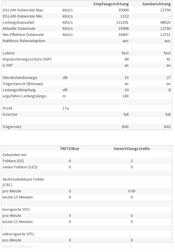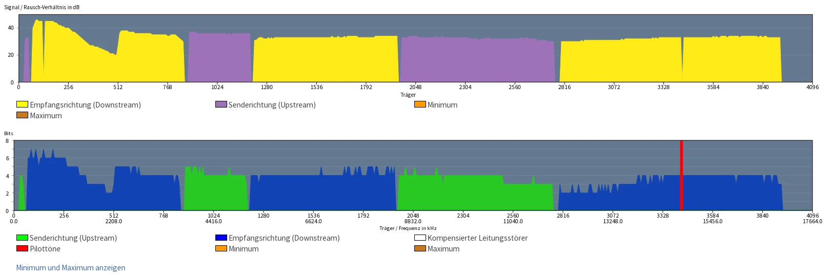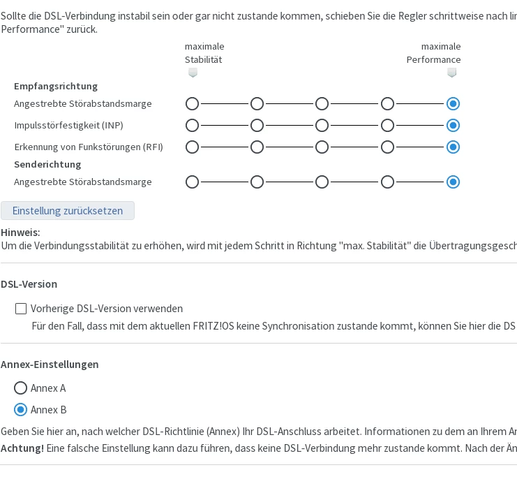 Ich habe allerdings in der Fritzbox bei den Störeinstellungen  die Punkte “Impulsstörungsschutz” und “Erkennung von Funkstörungen” auf “max. Stabilität” gestellt. Damit synct die Fritzbox mit einem höheren INP und blendet auch manche kritischen Träger, die für Funkübertragungen (meistens Amateurfunk) genutzt werden, besser aus als auf “max. Performance”.
