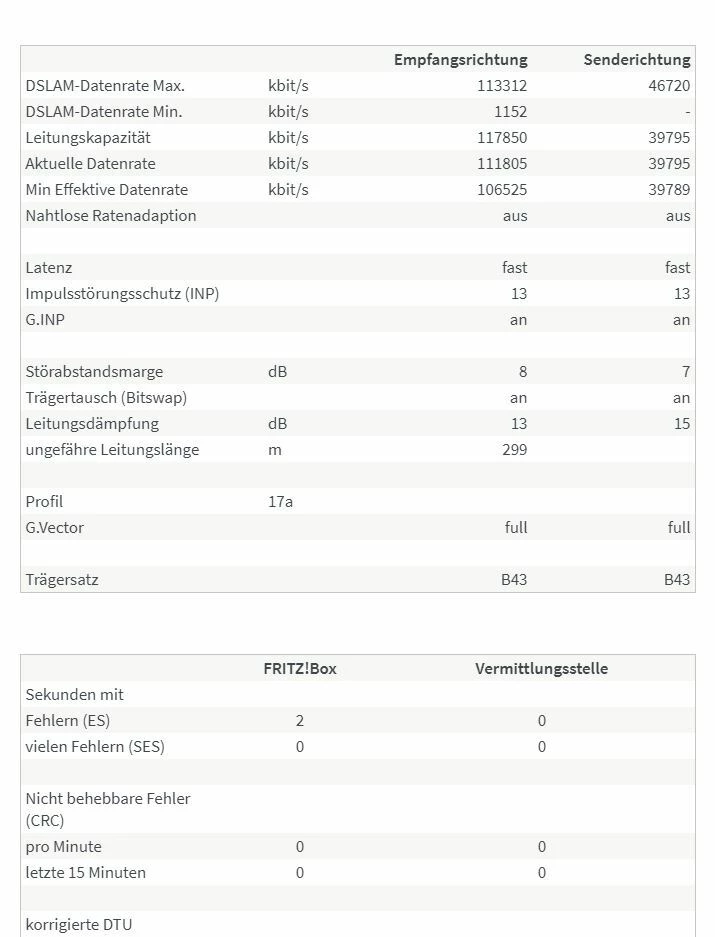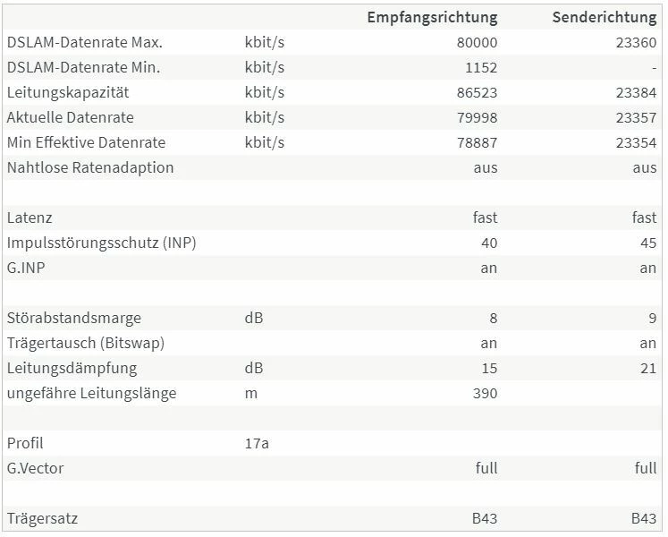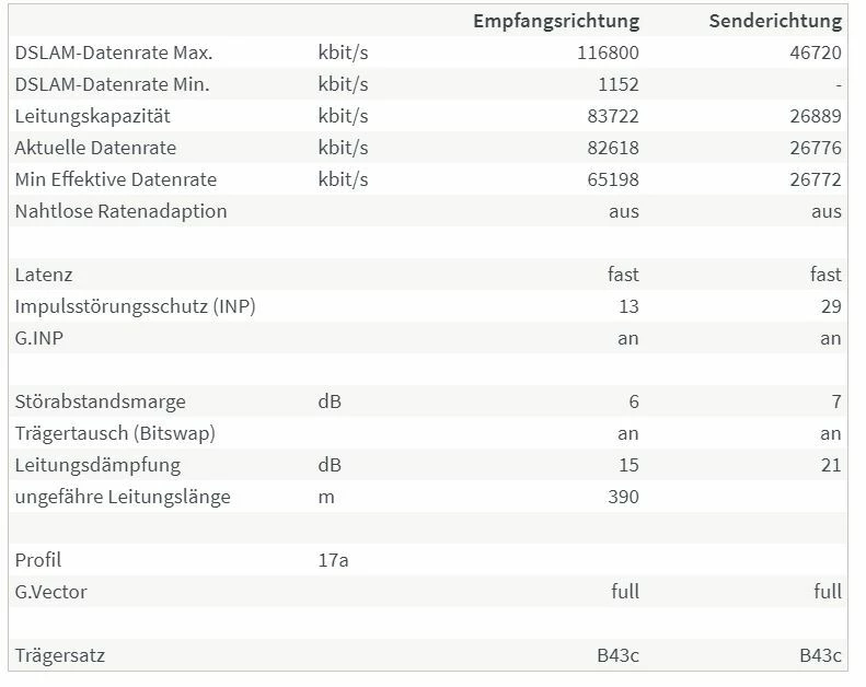 Poste bitte einen Screenshot der kompletten Tabelle unter “DSL” mit allen Leitungsparametern.