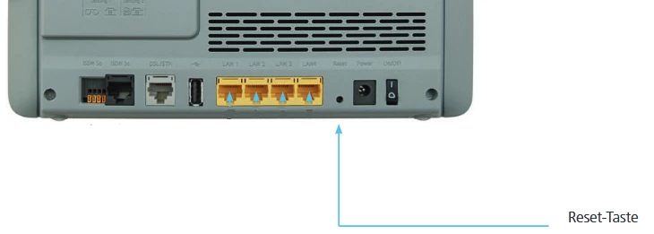 Die Reset-Taste etwa 10 bis 15 Sekunden gedrückt halten, bis die Power LED rot aufleuchtet. Dann bitte den Reset-Taster loslassen und warten, bis die Power LED wieder dauerhaft grün leuchtet.