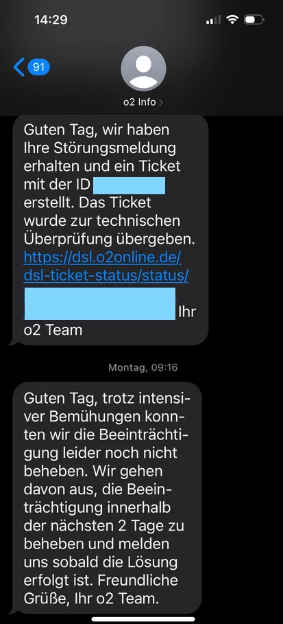 Guten Tag, wir haben Ihre Störungsmeldung erhalten und ein Ticket mit der ID XXXXXX erstellt. Das Ticket wurde zur technischen Überprüfung übergeben. https://dsl.o2online.de/dsl-ticket-status/status/XXXXXX. Ihr o2 Team