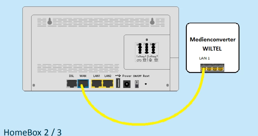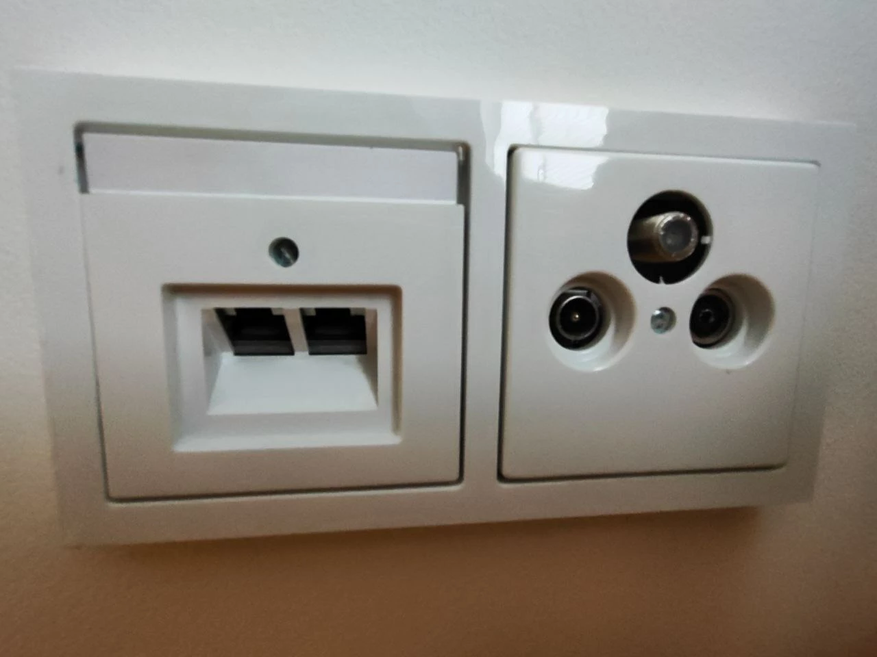Hier muss eigentlich ein Router an die Dose mit den eckigen Öffnungen angeschlossen werden.